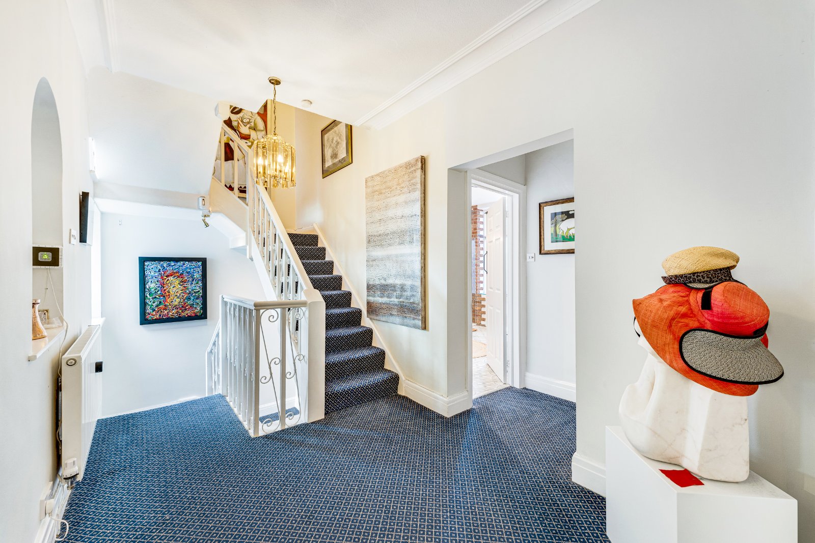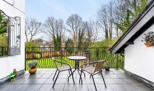 The first floor offers four generous bedrooms. The principal suite includes a large four-piece en suite bathroom, with the second bedroom also benefitting from its own en suite shower room. Bedroom three has access to a balcony overlooking the gardens and could easily serve as a home office or study. The remaining bedroom is served by a modern family bathroom and an additional WC.