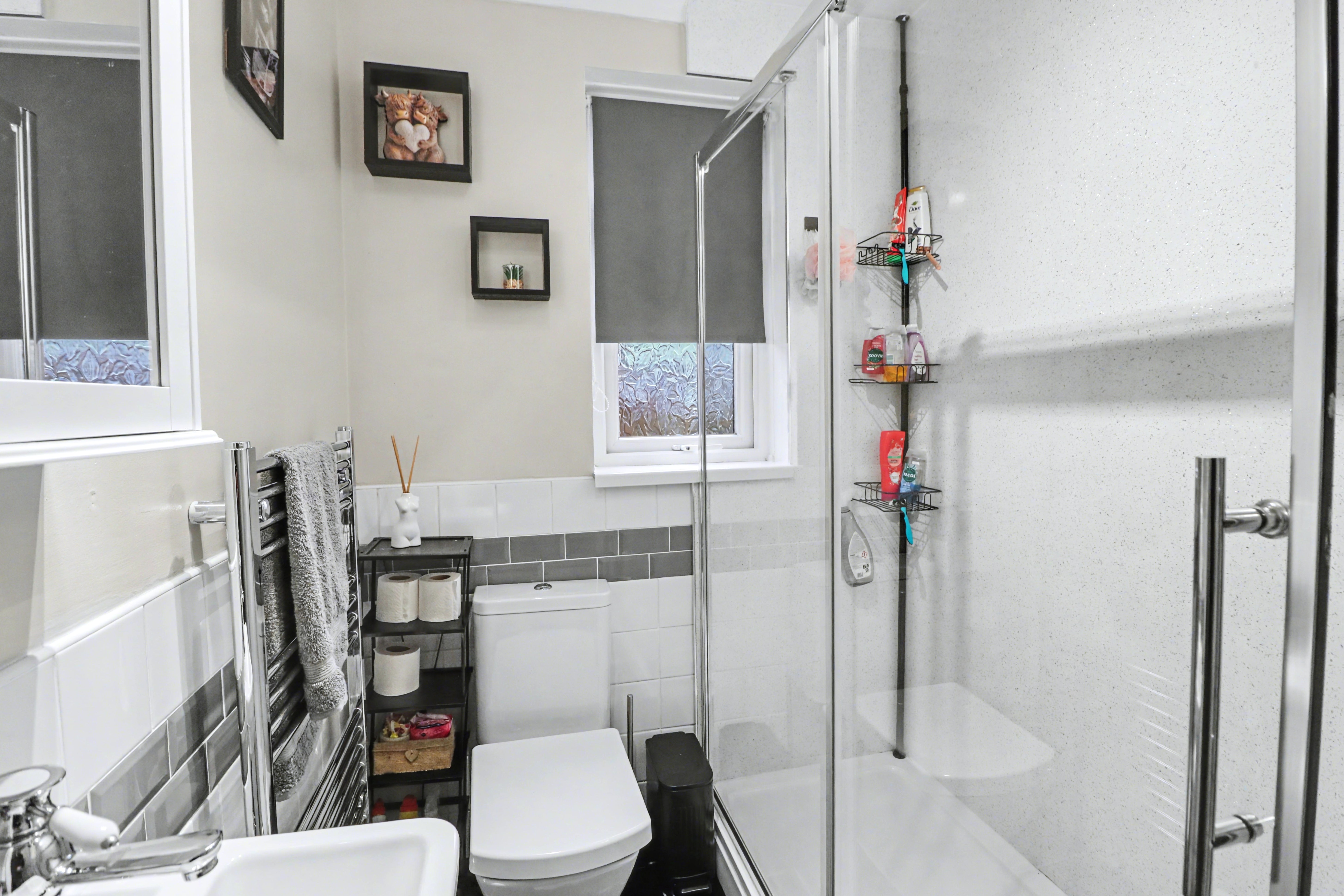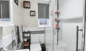 The modern shower room comprises a wash hand basin, WC, a shower cubicle, heated towel rail and a window to the side.
