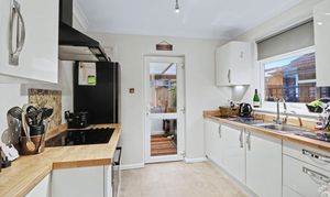 The modern kitchen has a window to the side and has been fitted with a modern range of wall and base units with a built-in oven and hob with extractor over and appliance space for a free-standing fridge/freezer.