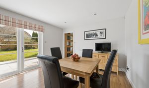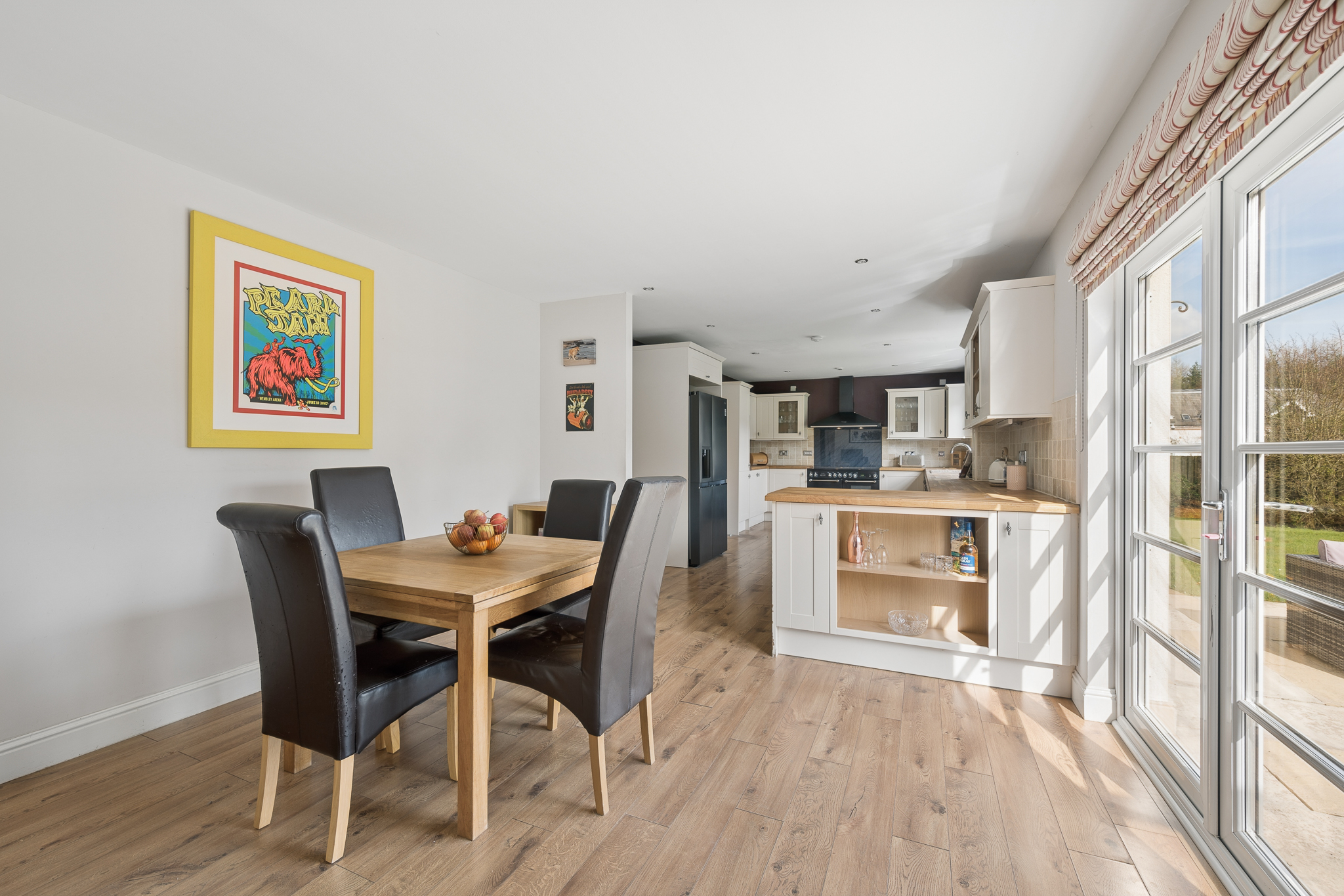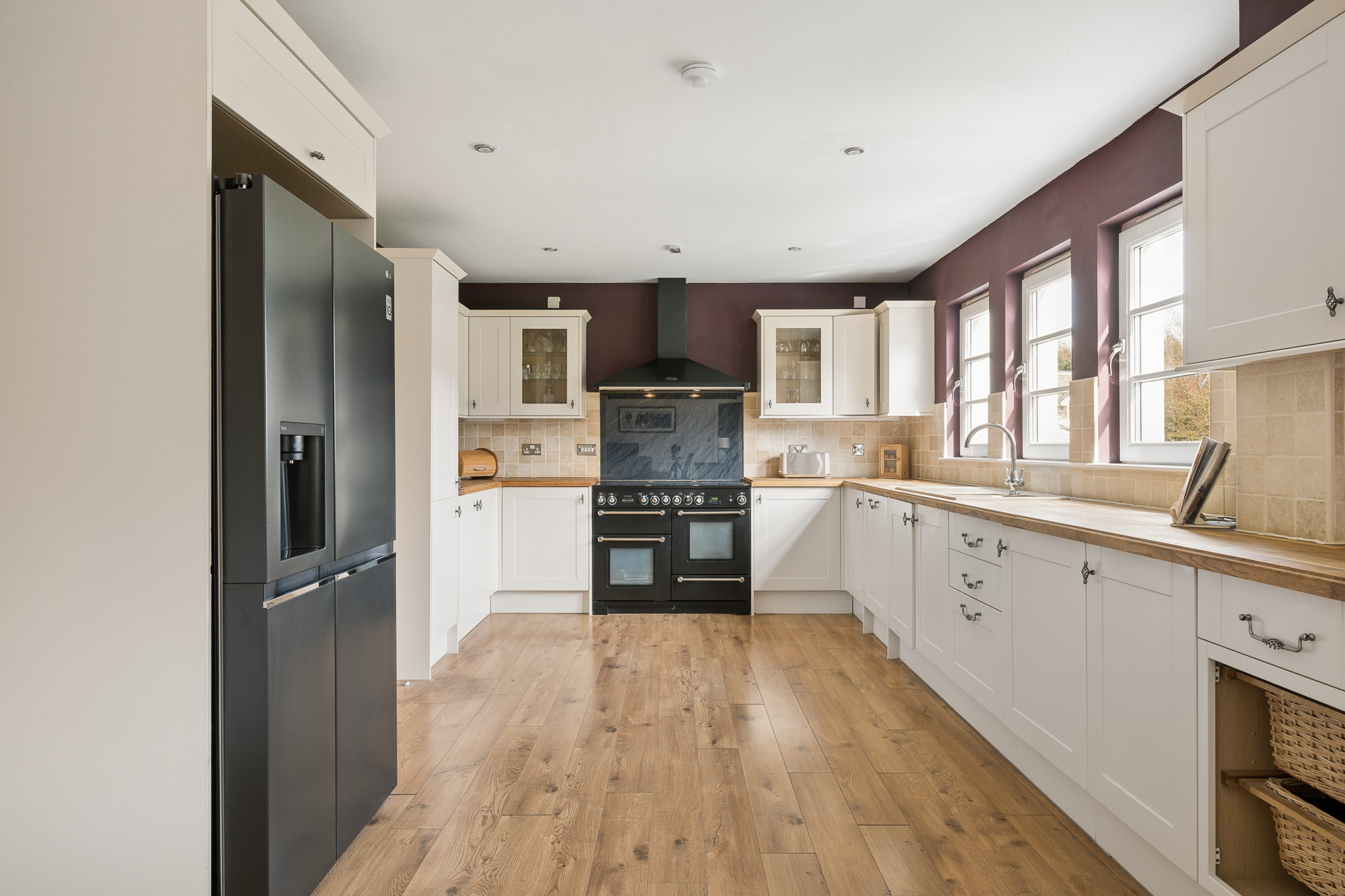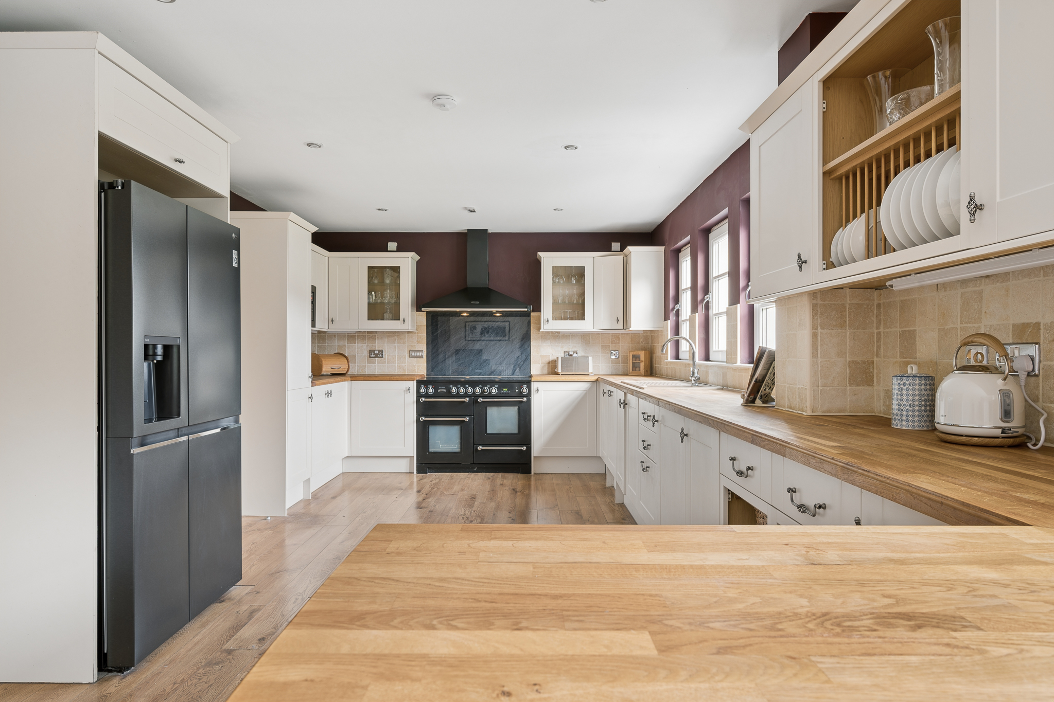 To the rear, the kitchen and dining area form the true centrepiece of the home. Thoughtfully designed and impeccably finished, the kitchen features timeless shaker style cabinetry, premium work surfaces and a range cooker, all complemented by elegant detailing and an abundance of storage. The proportions allow for effortless day to day living as well as entertaining on a larger scale, with the dining area enjoying direct access to the garden, perfectly extending the living space outdoors.