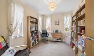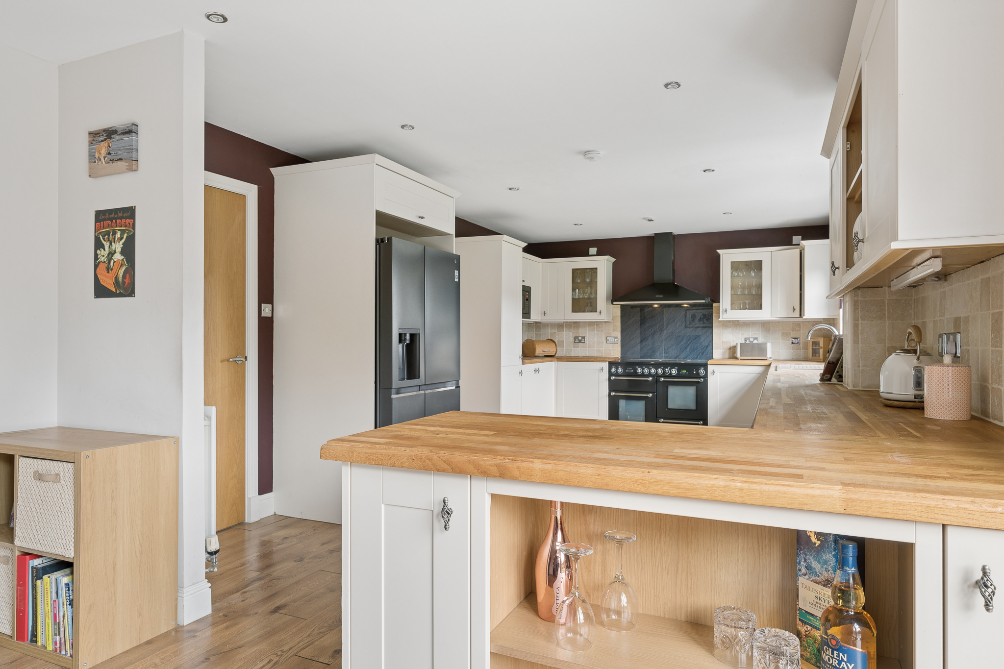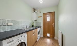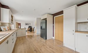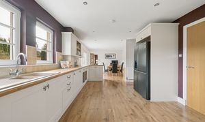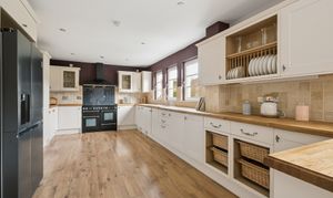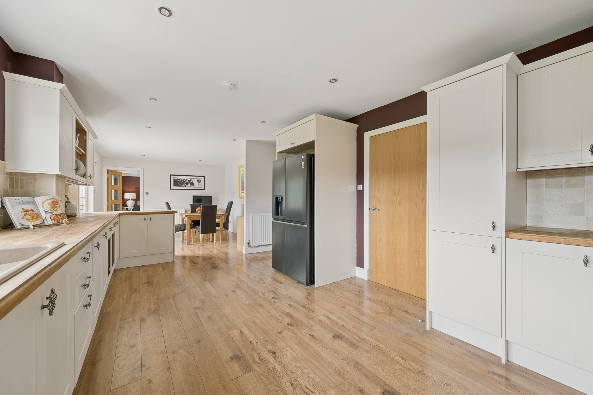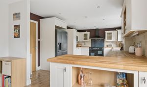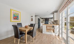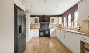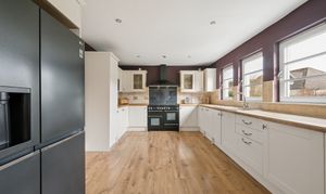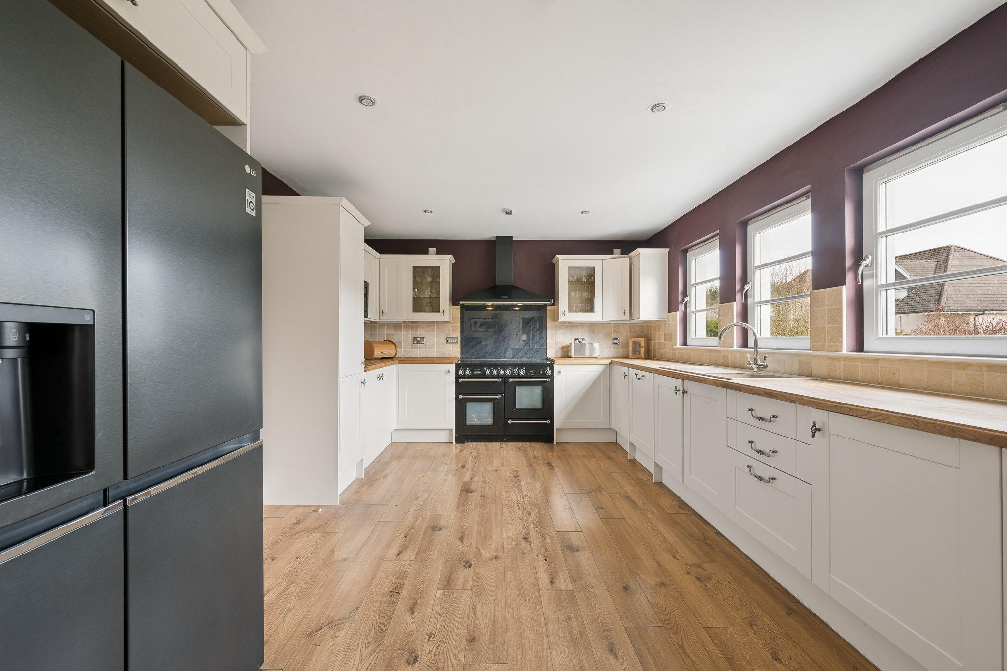To the rear, the kitchen and dining area form the true centrepiece of the home. Thoughtfully designed and impeccably finished, the kitchen features timeless shaker style cabinetry, premium work surfaces and a range cooker, all complemented by elegant detailing and an abundance of storage. The proportions allow for effortless day to day living as well as entertaining on a larger scale, with the dining area enjoying direct access to the garden, perfectly extending the living space outdoors.