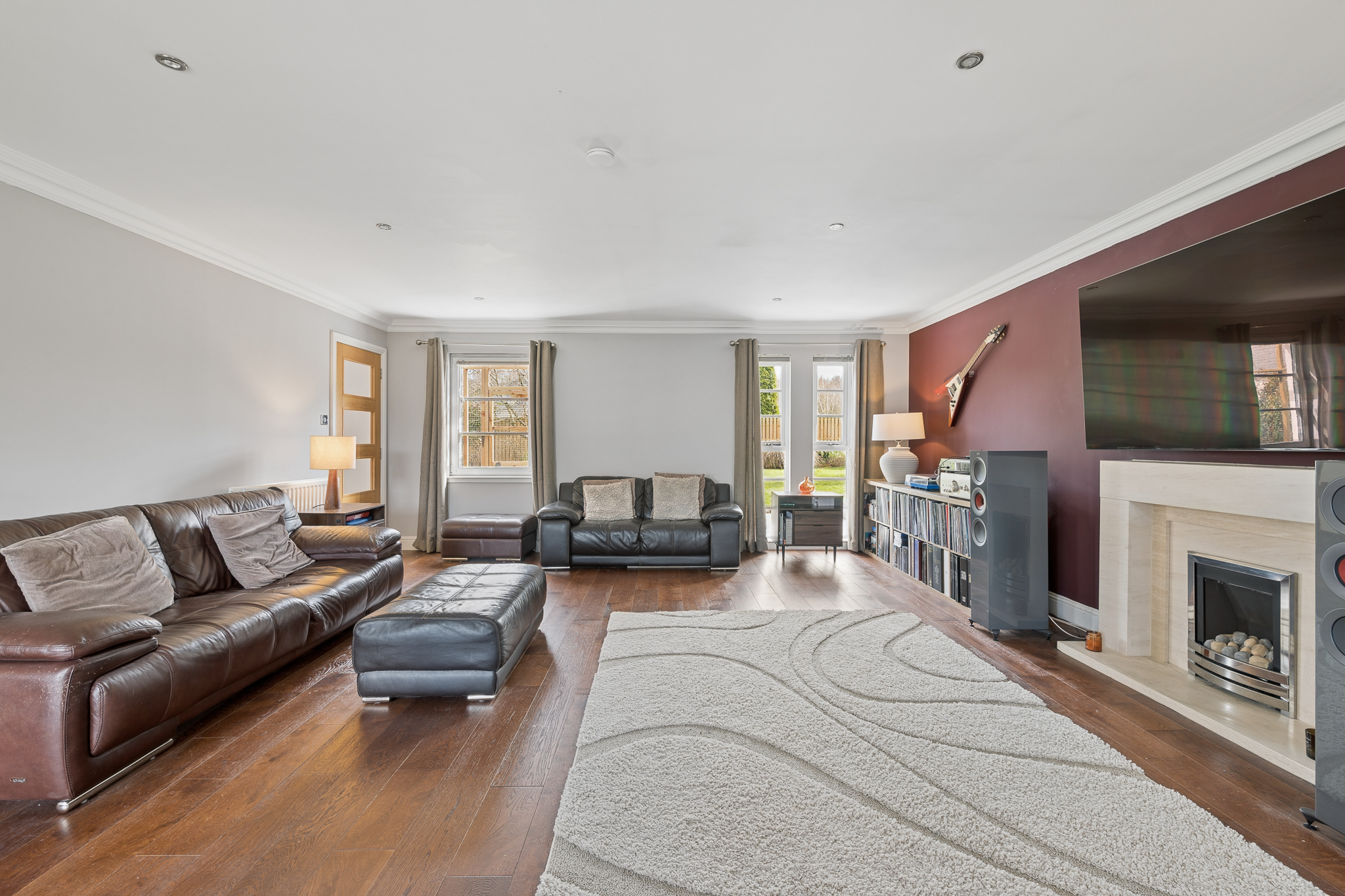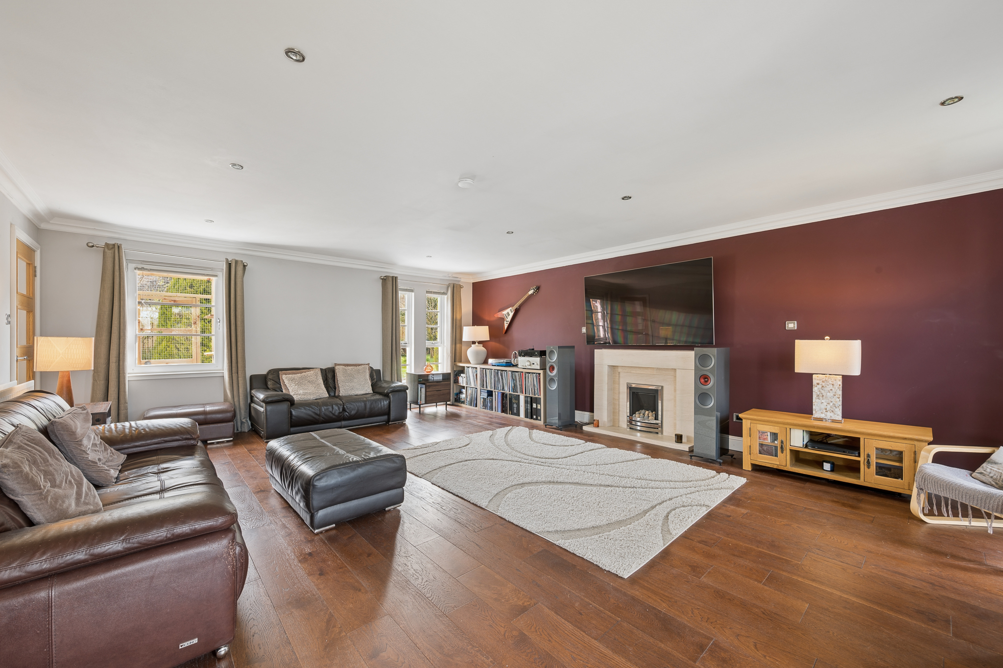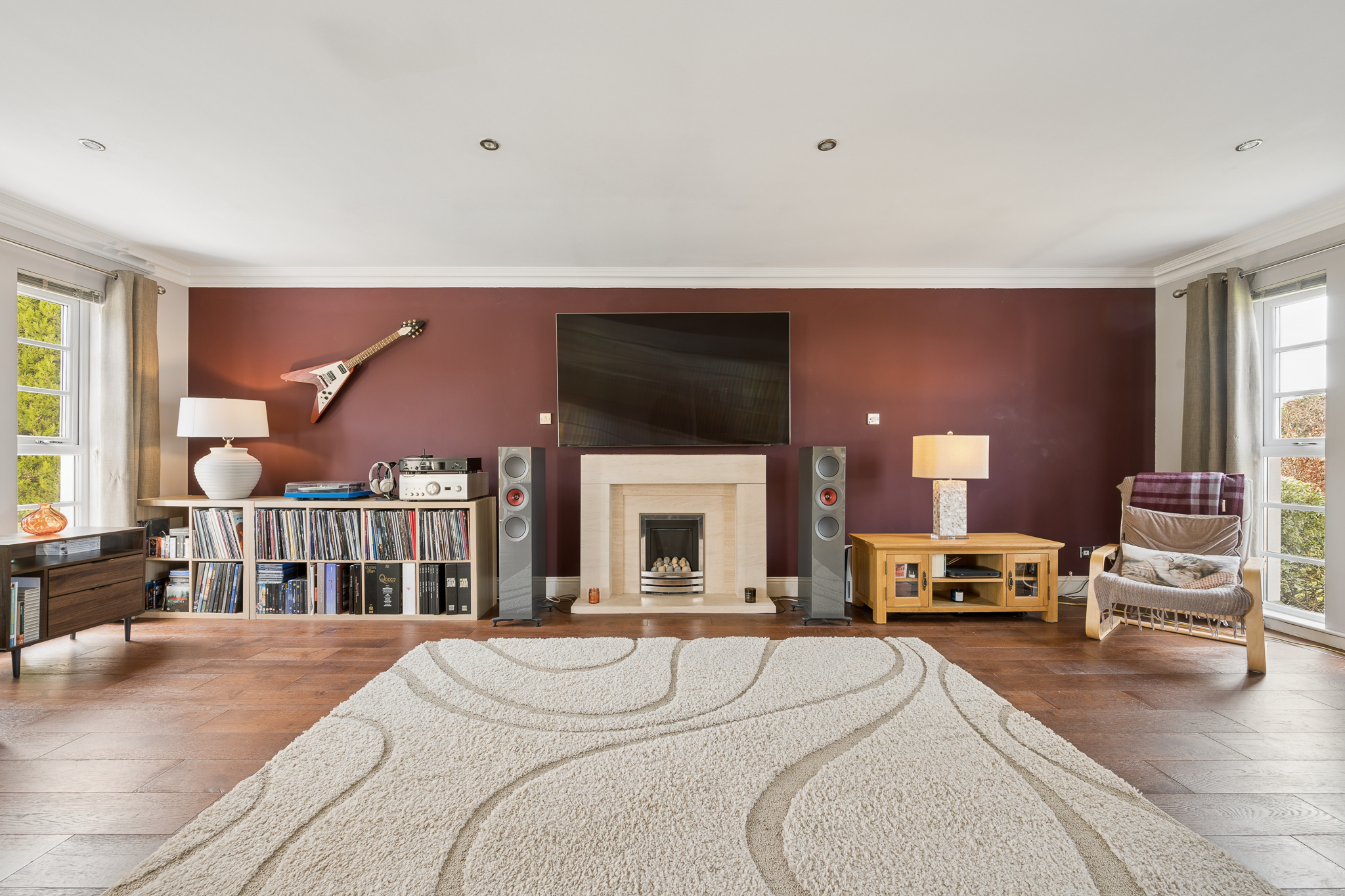 The principal lounge is a beautifully proportioned room, designed for both relaxation and entertaining. Rich flooring underfoot, a feature fireplace and carefully considered décor combine to create a warm yet refined living environment, with dual aspects allowing natural light to flood the space.