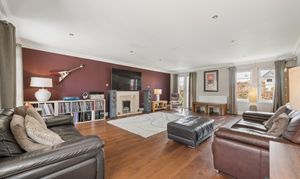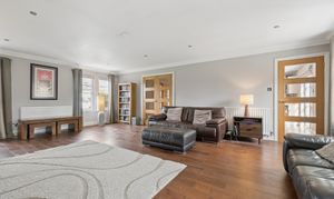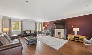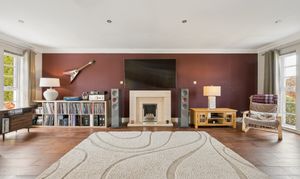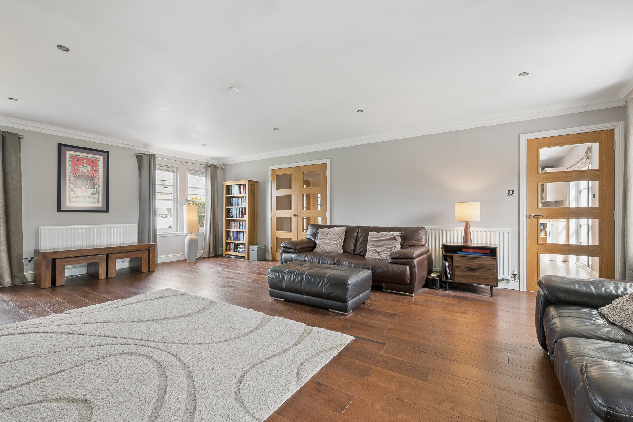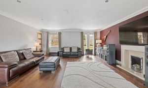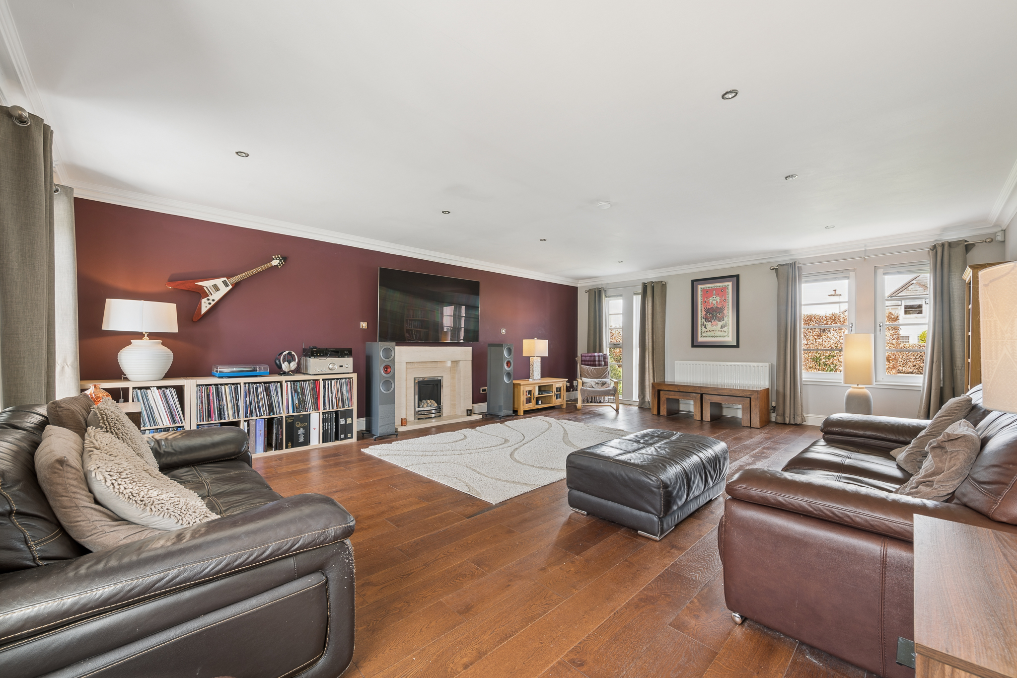 The principal lounge is a beautifully proportioned room, designed for both relaxation and entertaining. Rich flooring underfoot, a feature fireplace and carefully considered décor combine to create a warm yet refined living environment, with dual aspects allowing natural light to flood the space.