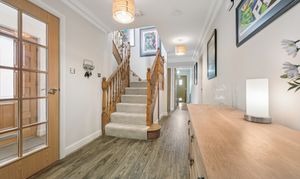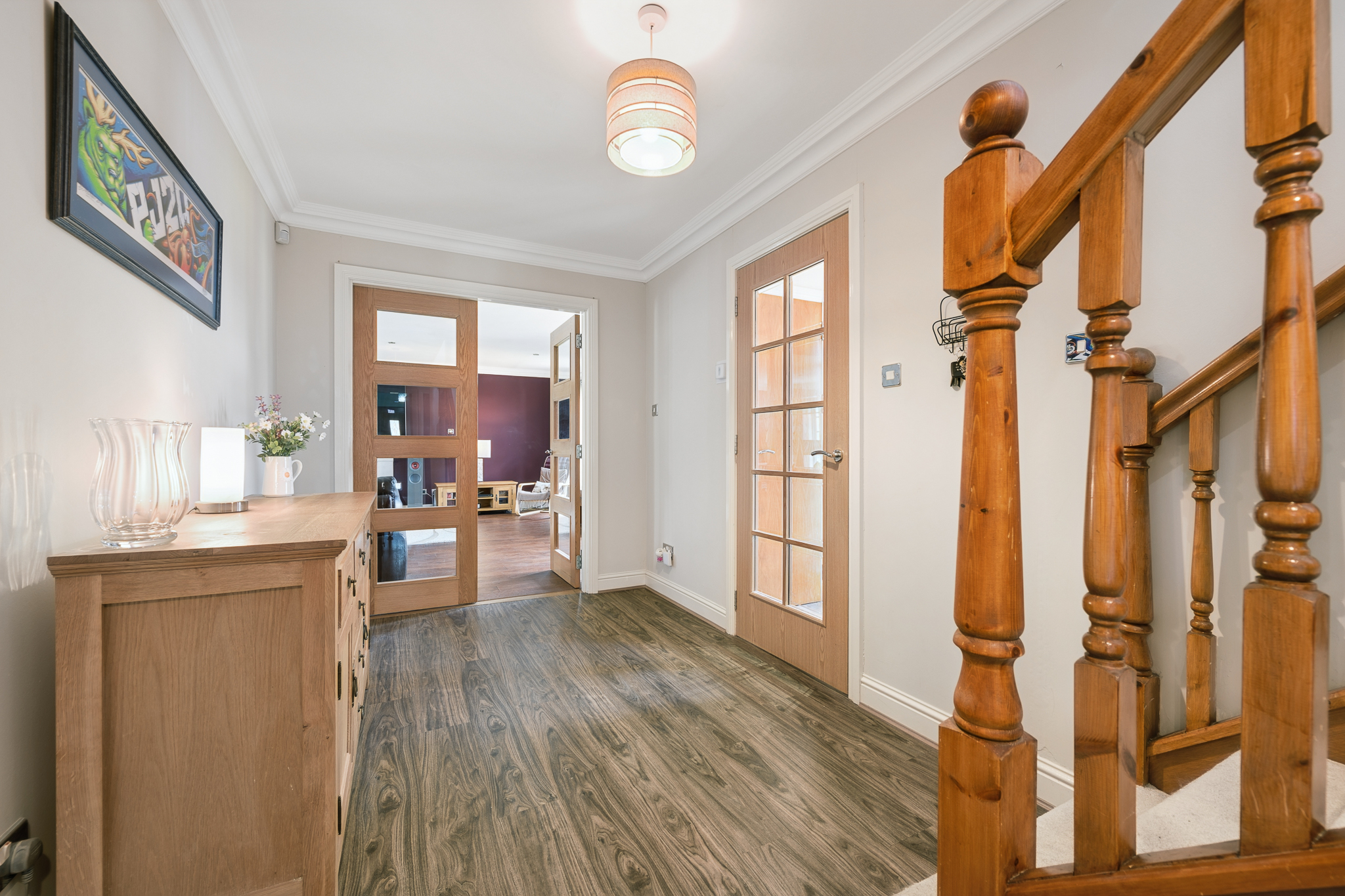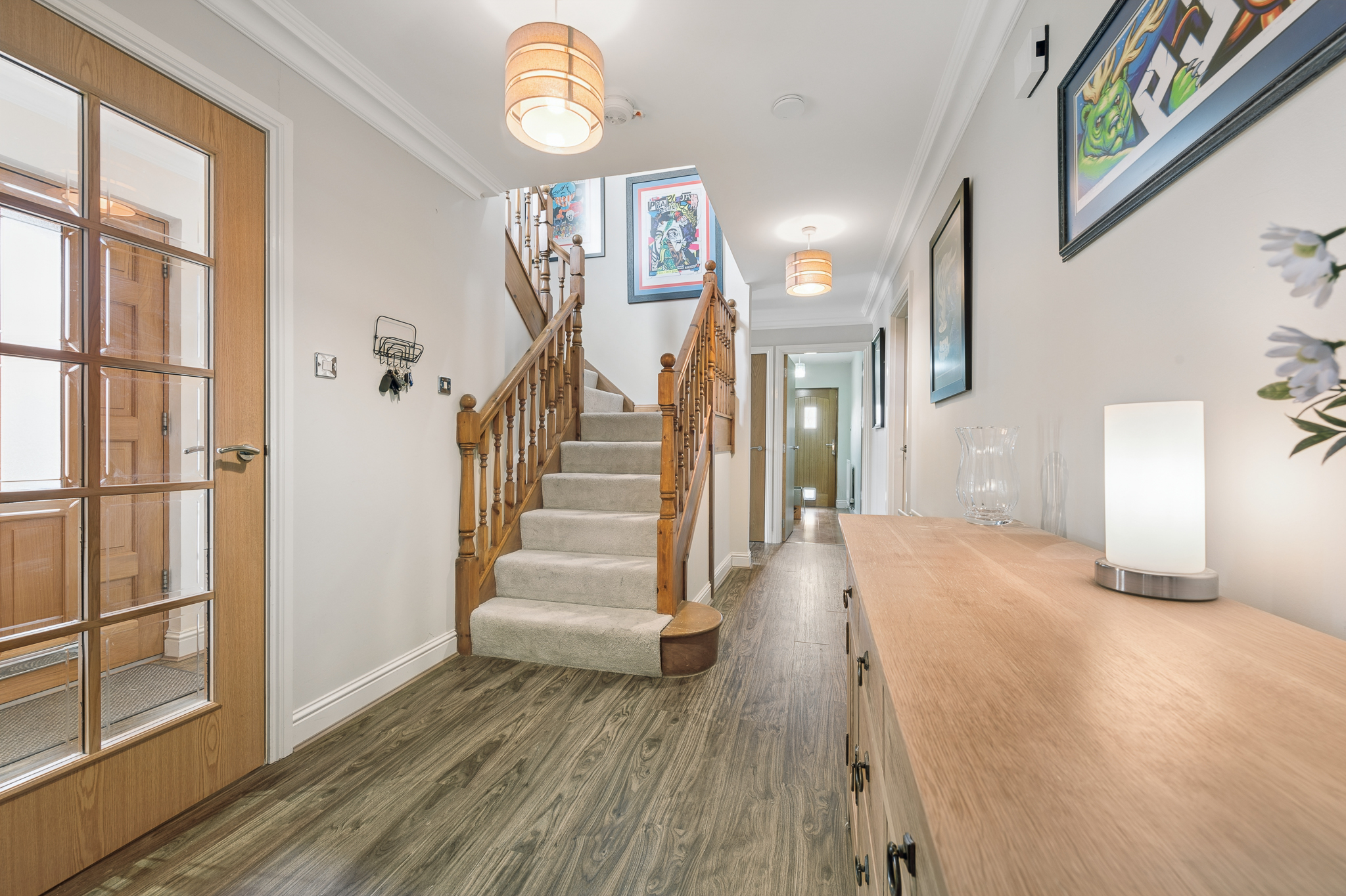 Entry is via an elegant vestibule/porch, complete with a practical storage cupboard, before opening into a broad and welcoming reception hallway. Finished in a sophisticated palette with high quality flooring, this space offers an immediate sense of scale, setting the standard for the accommodation throughout.