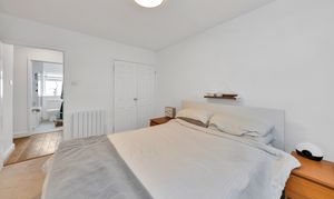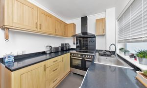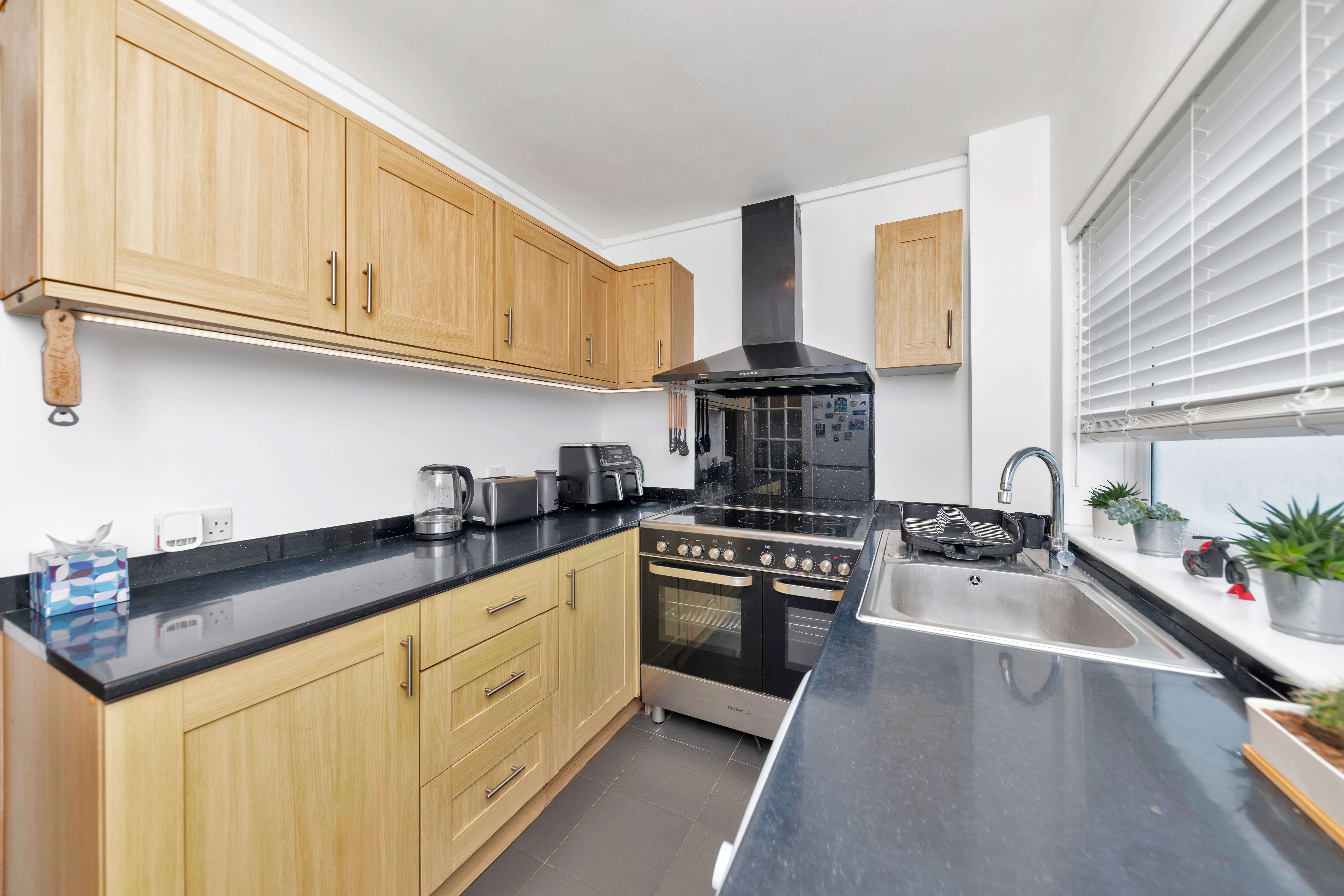 The kitchen is a very good size, enjoying a range of base and wall units, composite worktops, a range cooker, an extractor hood, tiled flooring, under-cabinet lighting, an integrated cupboard, a door and window to the rear communal gardens, and space for a fridge/freezer, dishwasher and other kitchen appliances.