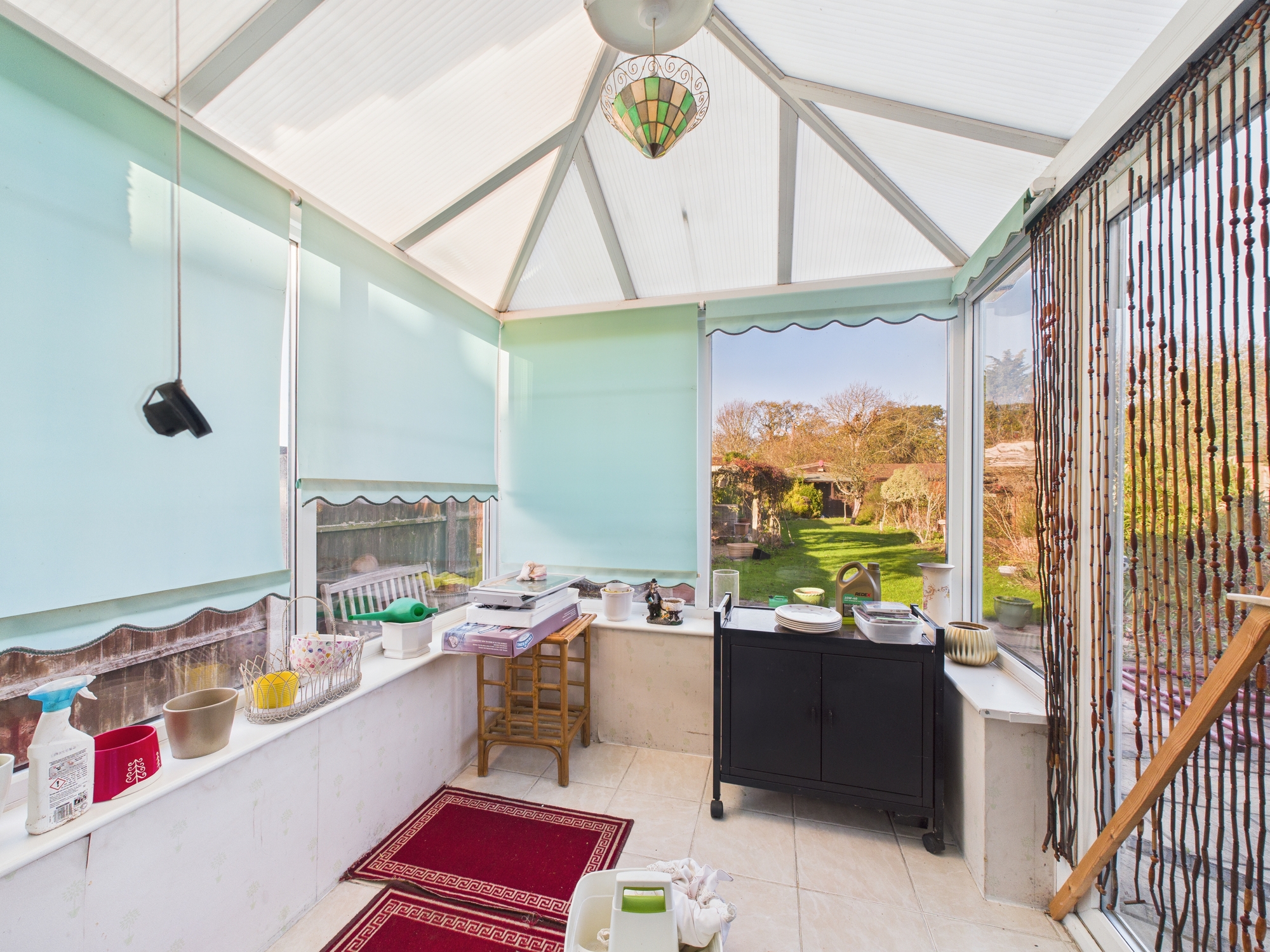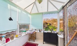 The kitchen offers a range of base units and generous countertop space, with access to a bright conservatory providing tranquil garden views and direct access to a paved patio area.