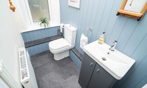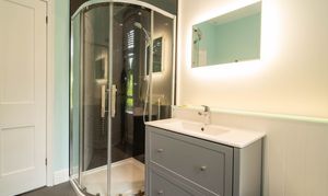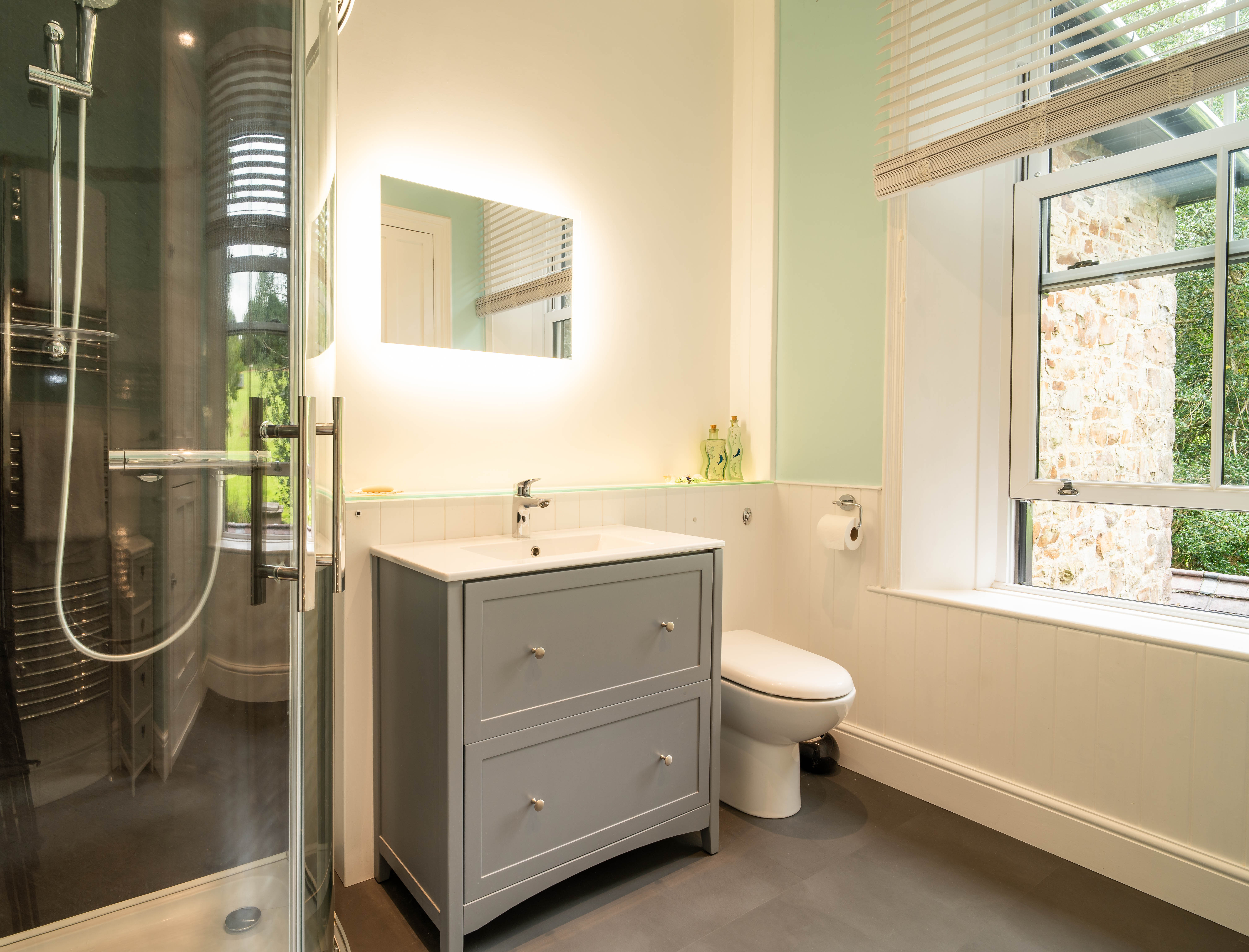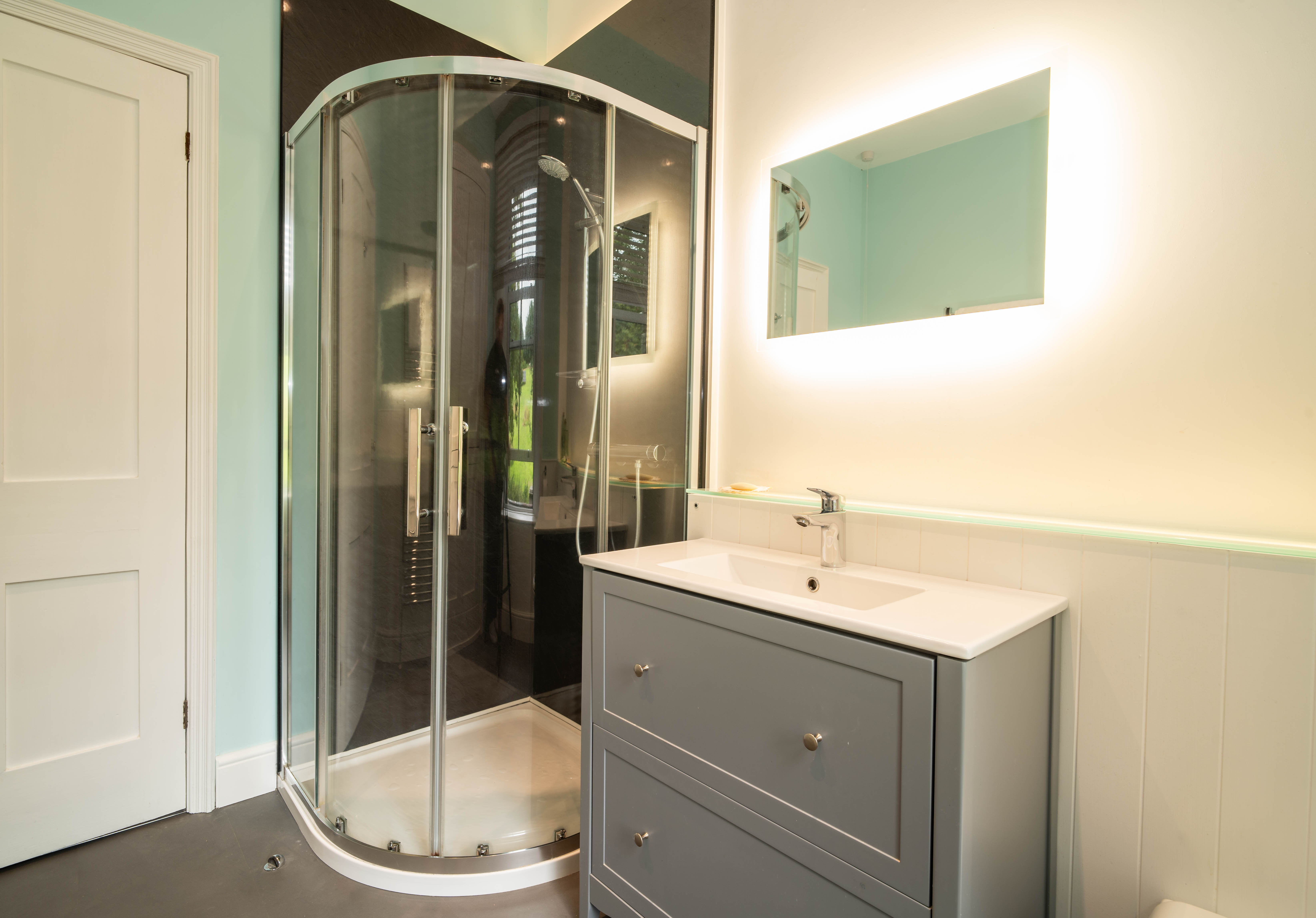 This contemporary first-floor shower room is finished to a high standard, featuring a sleek corner shower enclosure with chrome fittings and a modern vanity unit with inset wash basin with ample storage beneath and WC. A large illuminated mirror enhances the sense of space and light, while the fresh décor and clean lines create a stylish, modern look. A practical and well-designed space, perfect for everyday use.