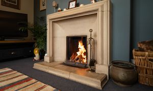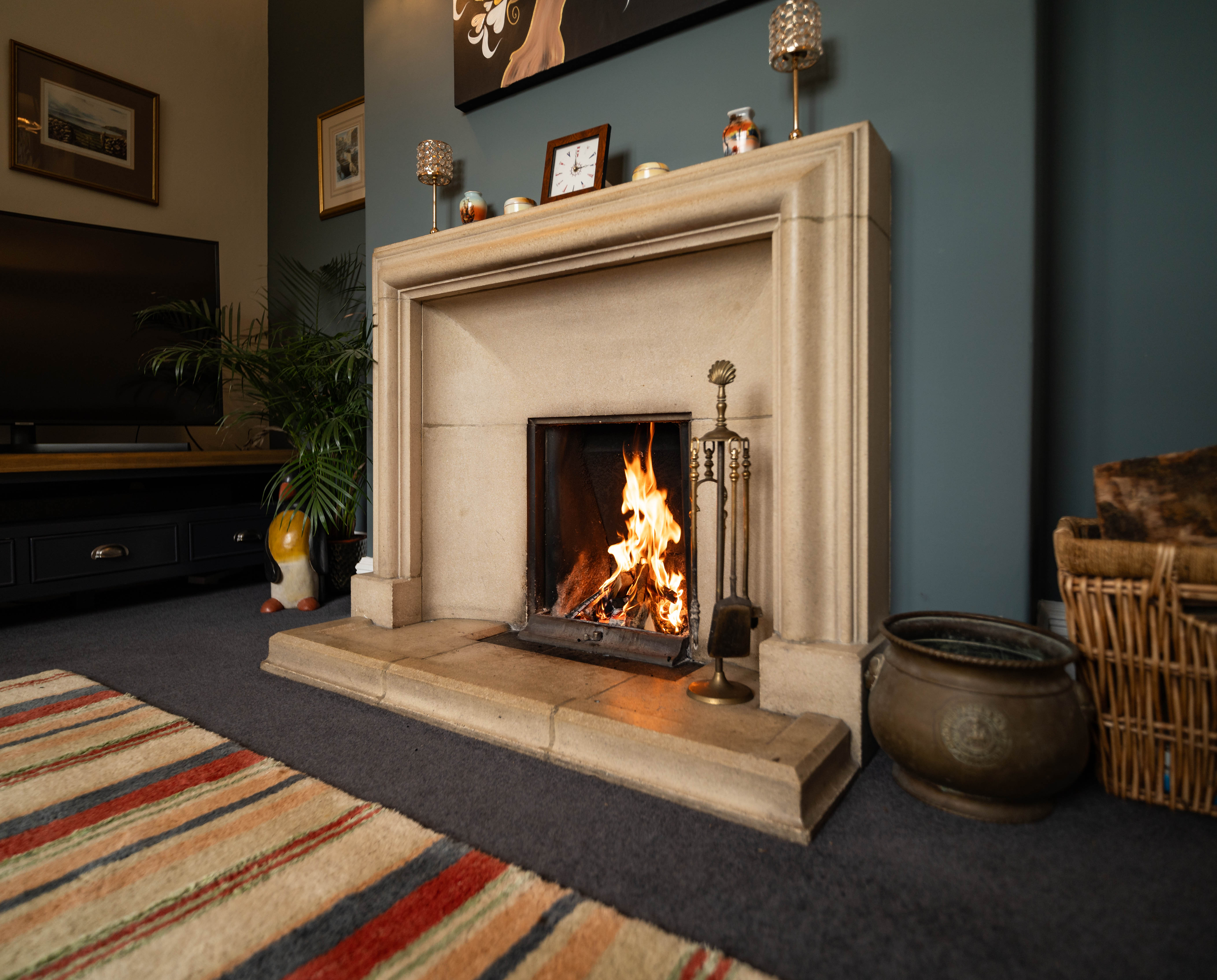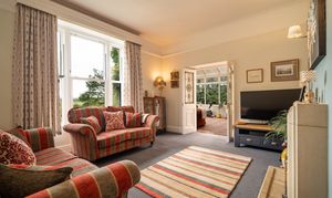 A beautifully proportioned sitting room with large sash windows framing views of the surrounding countryside. This inviting space features a late Victorian Purbeck stone fireplace with open hearth, providing a cosy focal point for cooler months. Neutral décor, high ceilings and period detailing add to the sense of light and space, while glazed double doors open directly into the adjoining sun room, blending indoor and outdoor living.