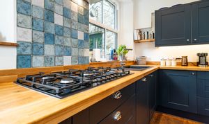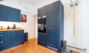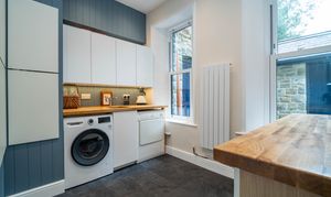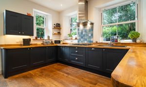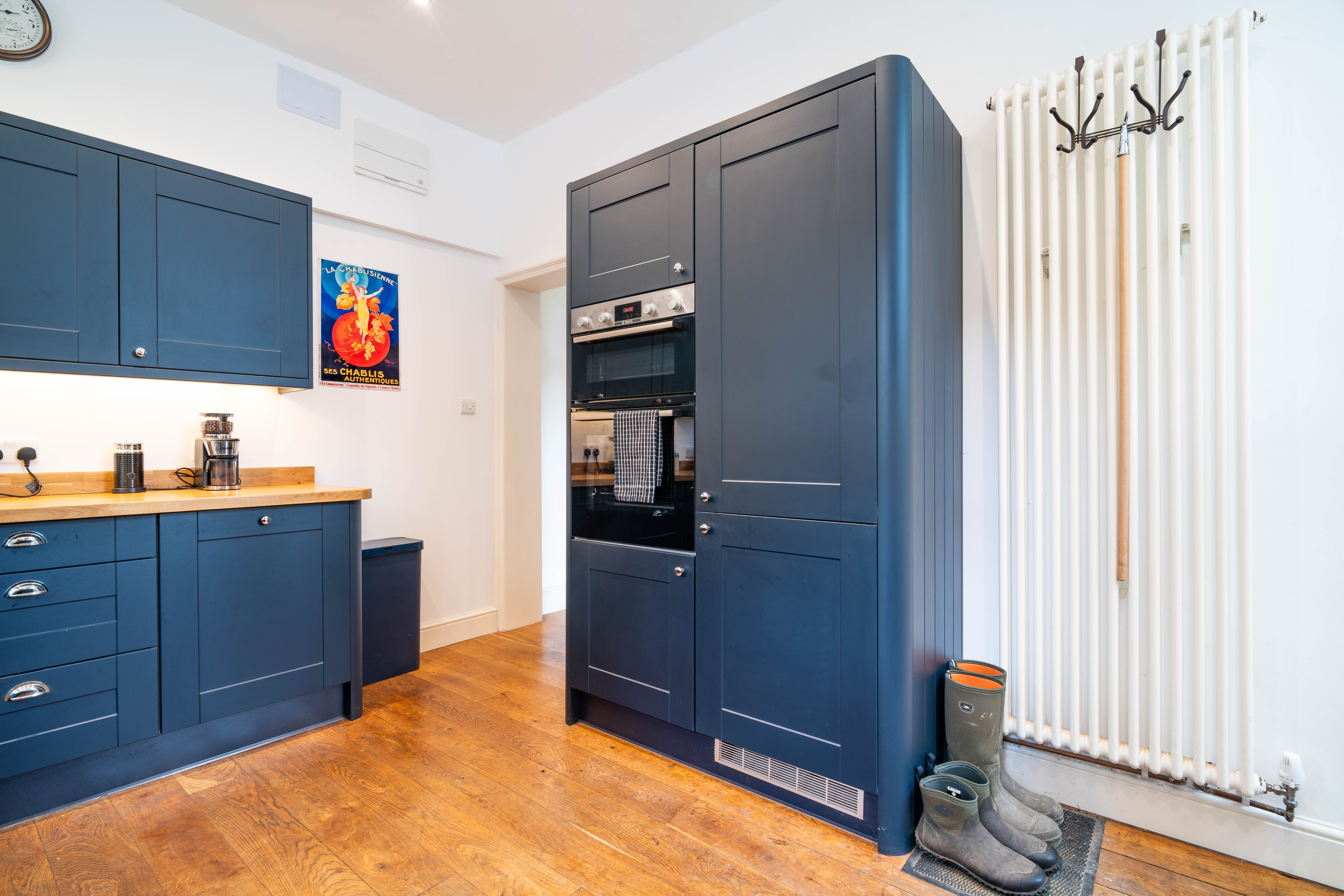 This stunning kitchen, linked to the breakfast room, is fitted with a stylish range of dark shaker-style units, beautifully complemented by solid oak worktops. A tiled hob splashback adds a touch of character, while the integrated gas hob with stainless steel extractor fan provides both practicality and a modern finish. The room is flooded with natural light thanks to the large windows, offering delightful views over the paddock creating a bright and welcoming atmosphere. Open shelving and ample cupboard space ensure excellent storage options.