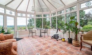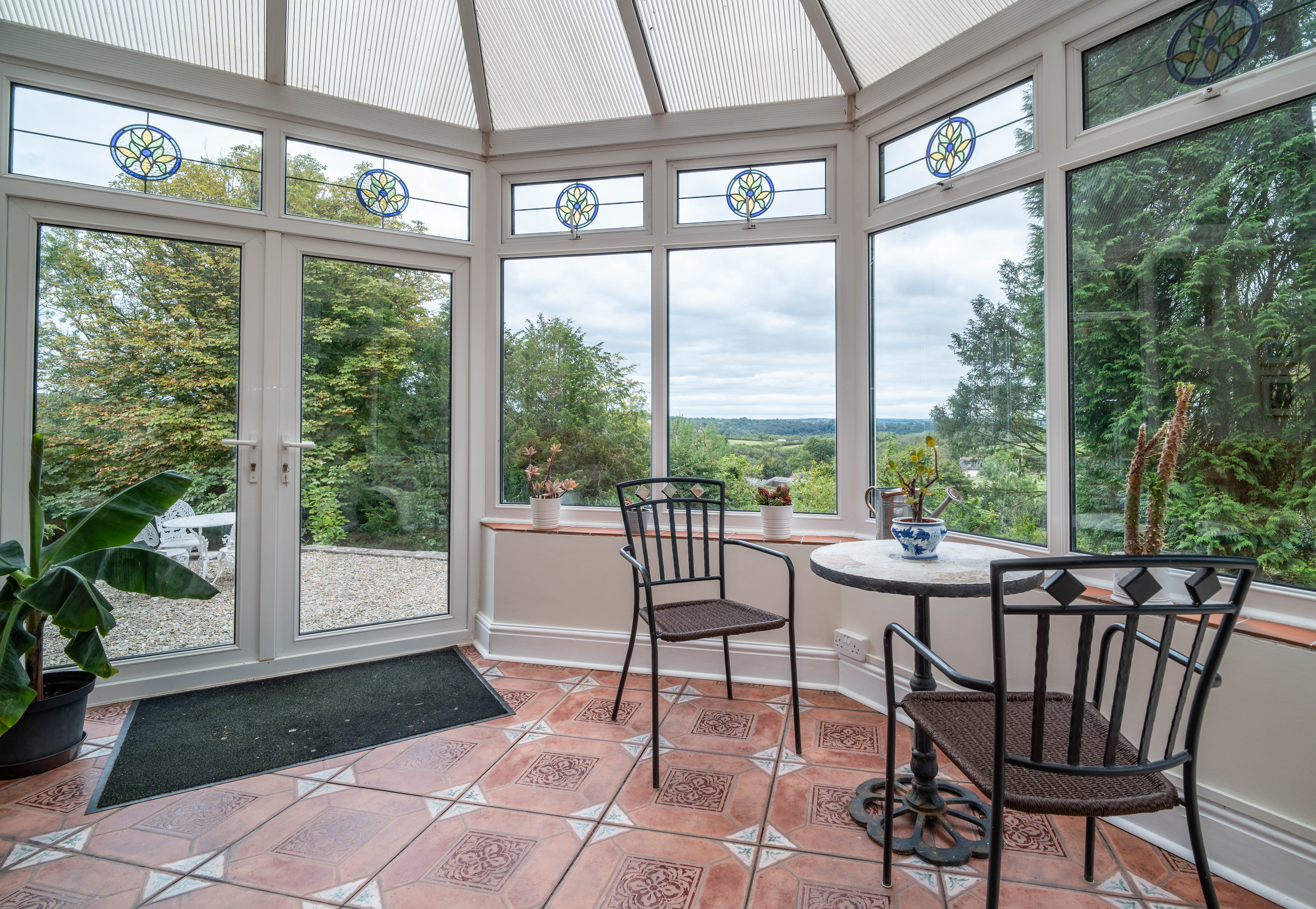An expansive light-filled conservatory-style room with panoramic views of the gardens and countryside. Perfect for relaxing, growing plants or enjoying views over the garden throughout the day.