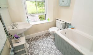 This beautifully presented light and airy bathroom offers a stylish and practical space, complete with a modern three-piece suite comprising a pedestal sink, WC and panelled bath and chrome fittings .