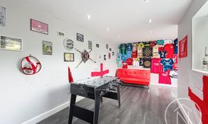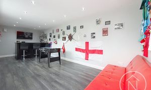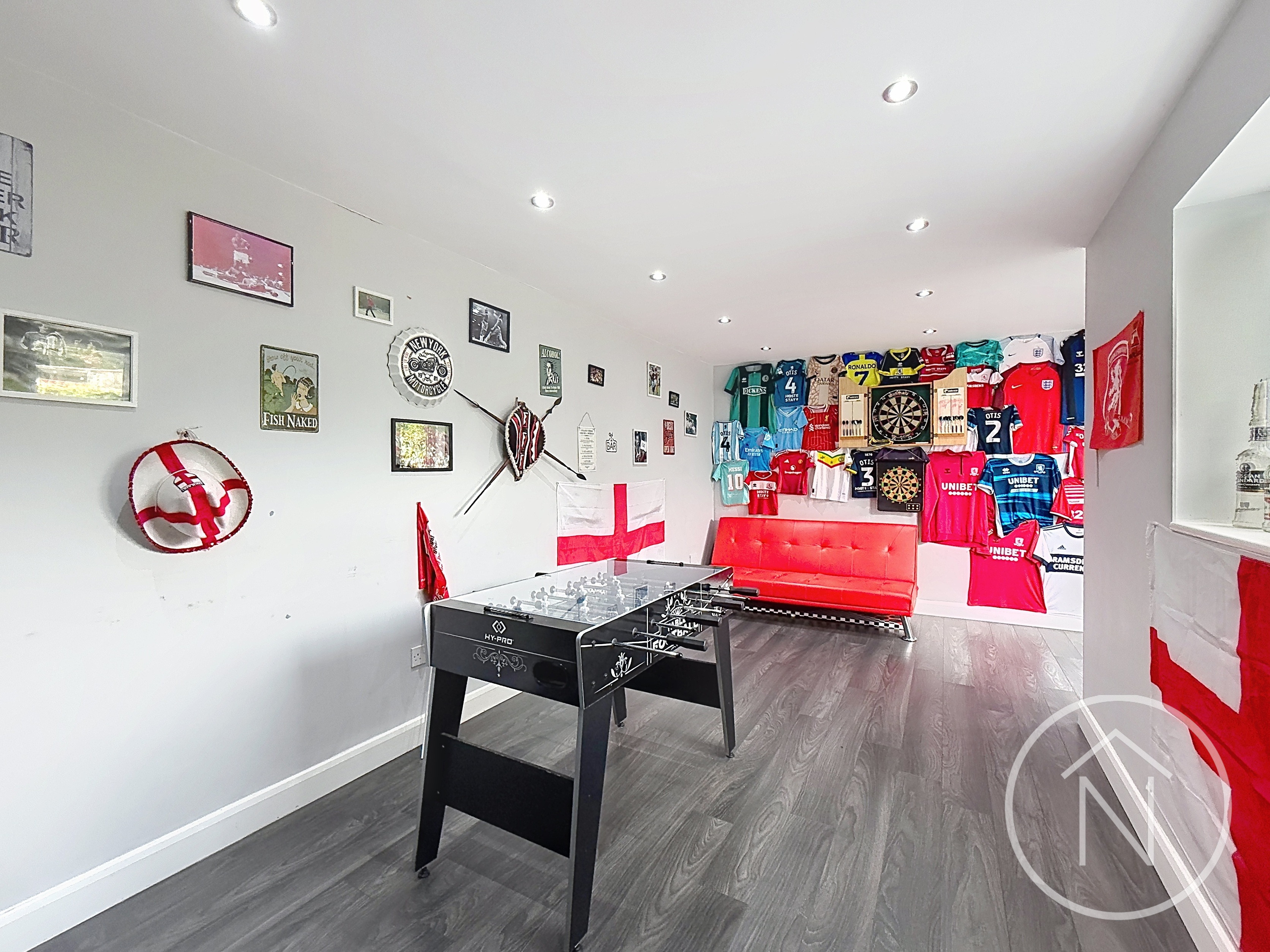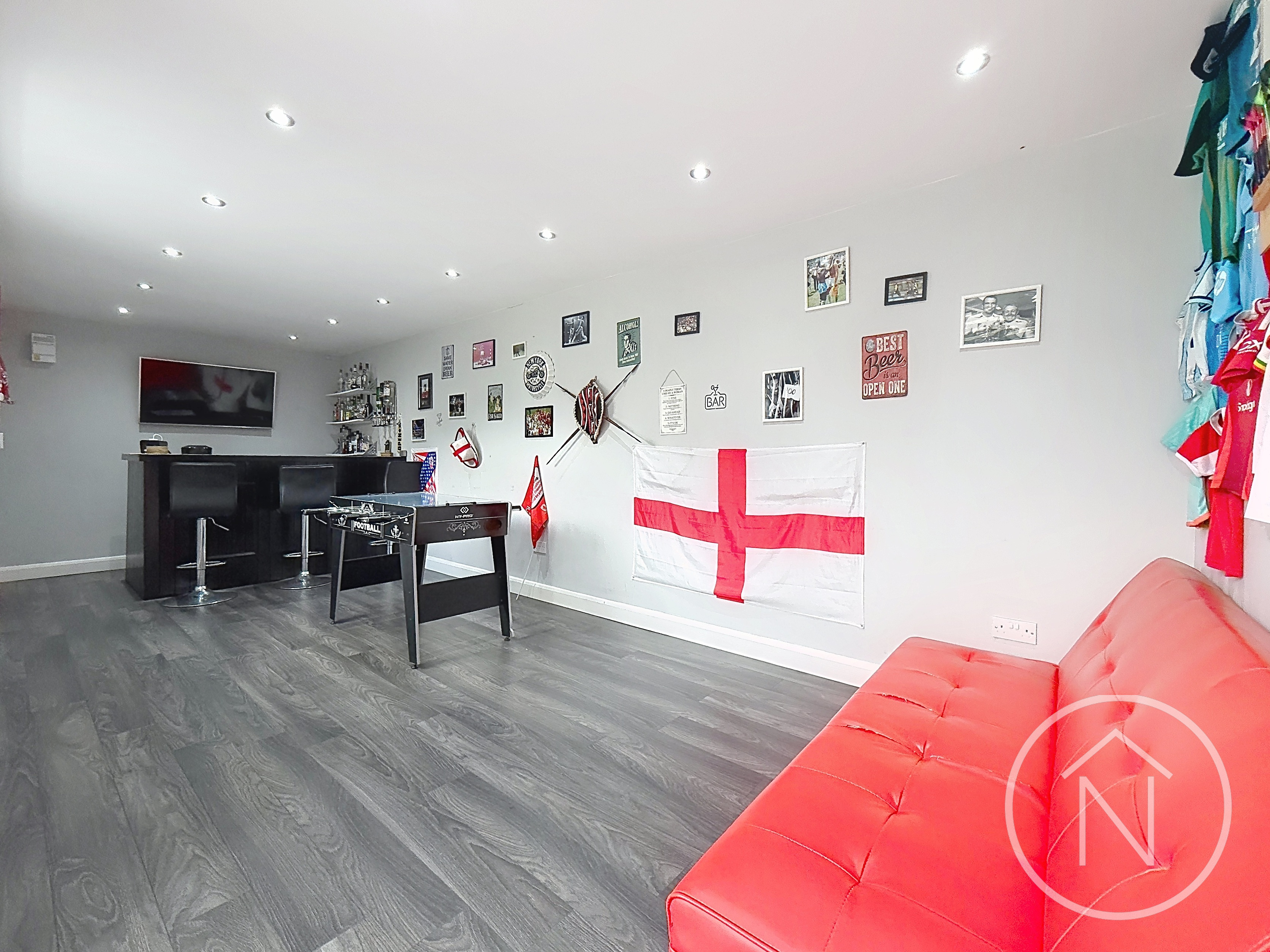 Externally, the home continues to impress with a west-facing, low maintenance rear garden, complete with a converted garage currently used as a garden bar, making it a great space for hosting. To the front, there is a driveway providing off-road parking.