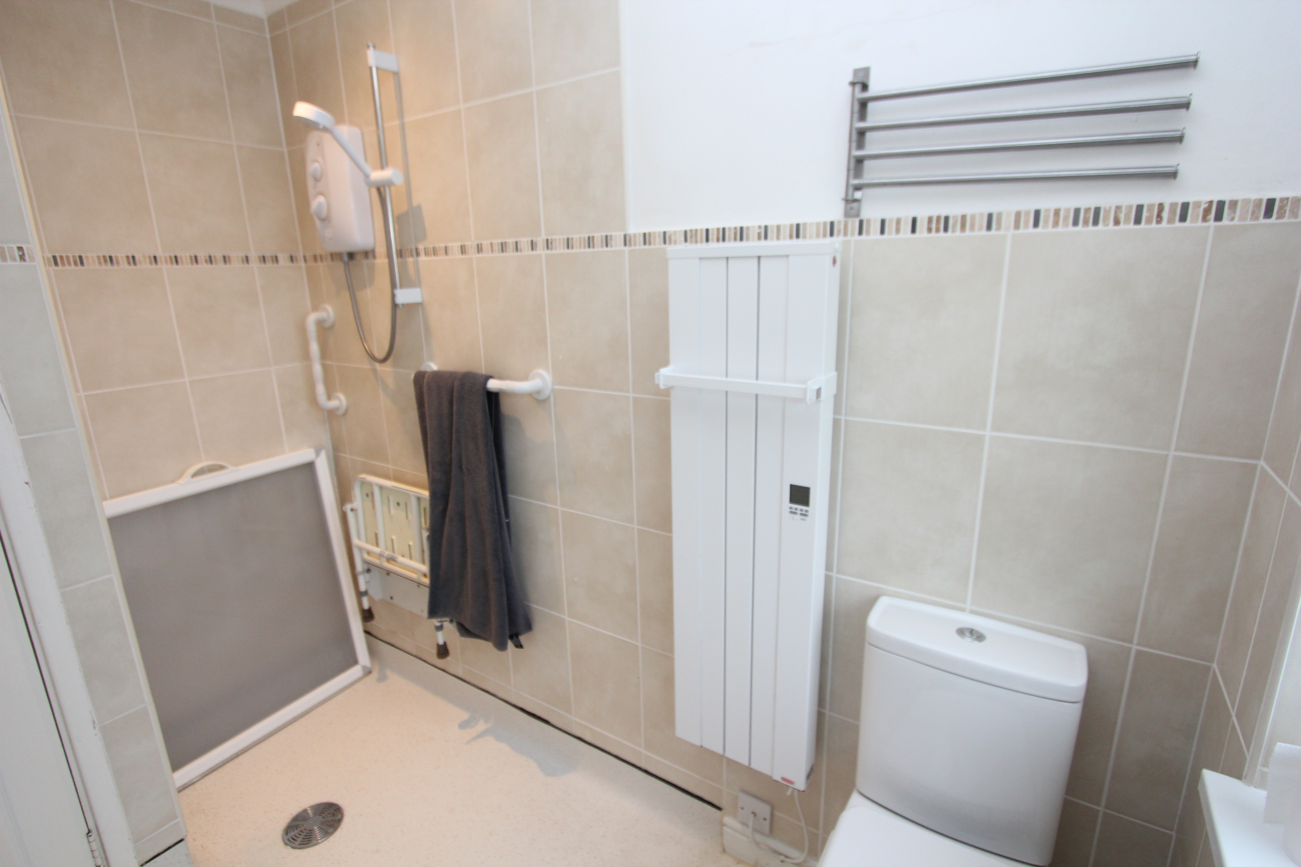 UPVC opaque window to front. Low level WC. Electric vertical radiator. Wash hand basin with mixer tap. Electric mixer shower. Non slip flooring.