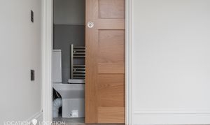 Designed as calm, elegant retreats, the bathrooms at Roman Way combine refined materials with clever design. Porcelain Viente Urbancrete tiles wrap the space, complemented by chrome fixtures and fittings for a crisp, modern finish.