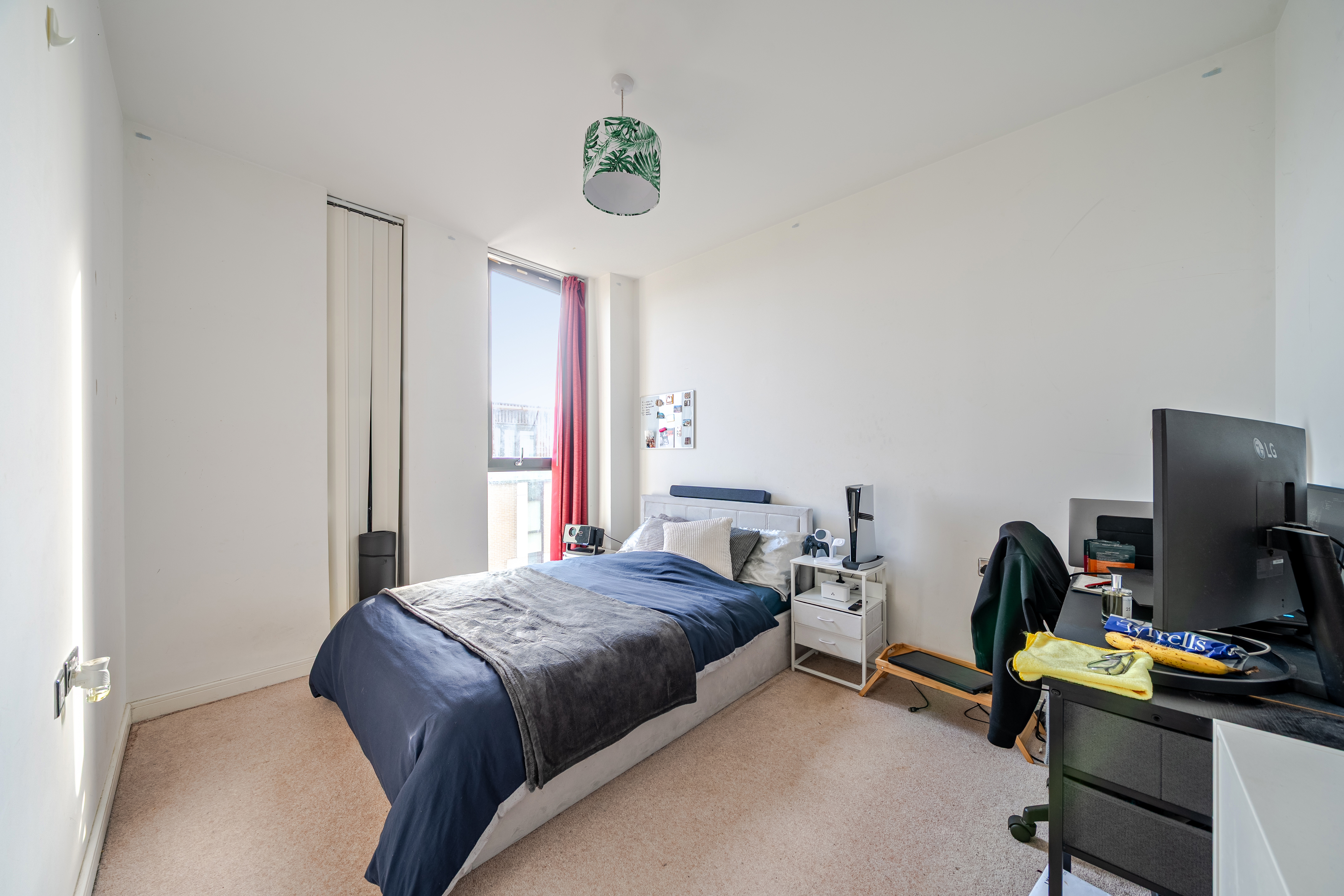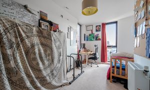 Set on the fourth floor South facing, the property enjoys an abundance of natural light throughout, highlighting its modern interiors and thoughtful layout. Both bedrooms are generous doubles, offering plenty of space for wardrobes and desks, while the open plan living and dining area is perfect for relaxing or entertaining. The kitchen is sleek and contemporary, fitted with integrated appliances and ample storage, making it ideal for home cooks. The bathroom is finished to a high standard with stylish tiling and a full-sized bath.