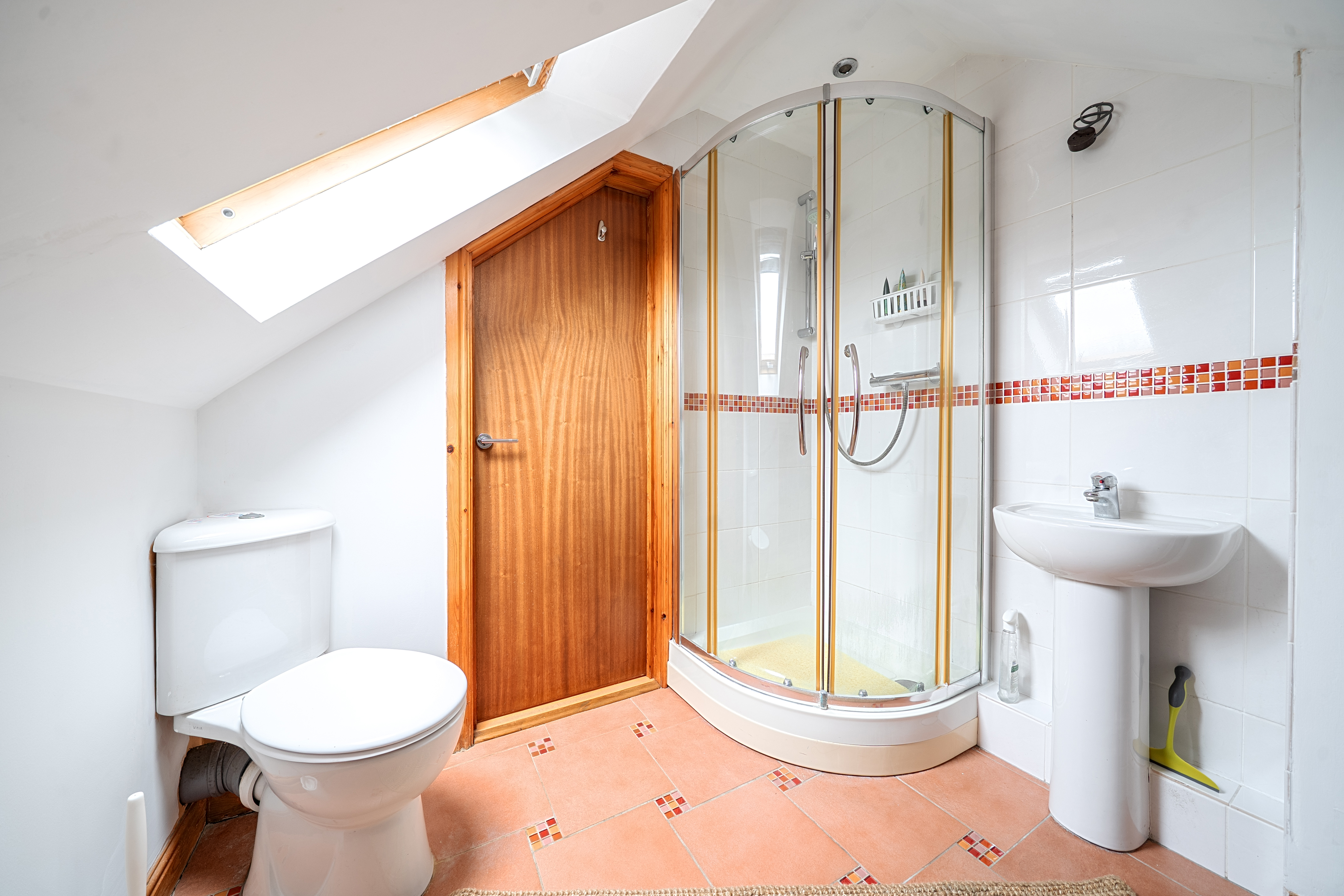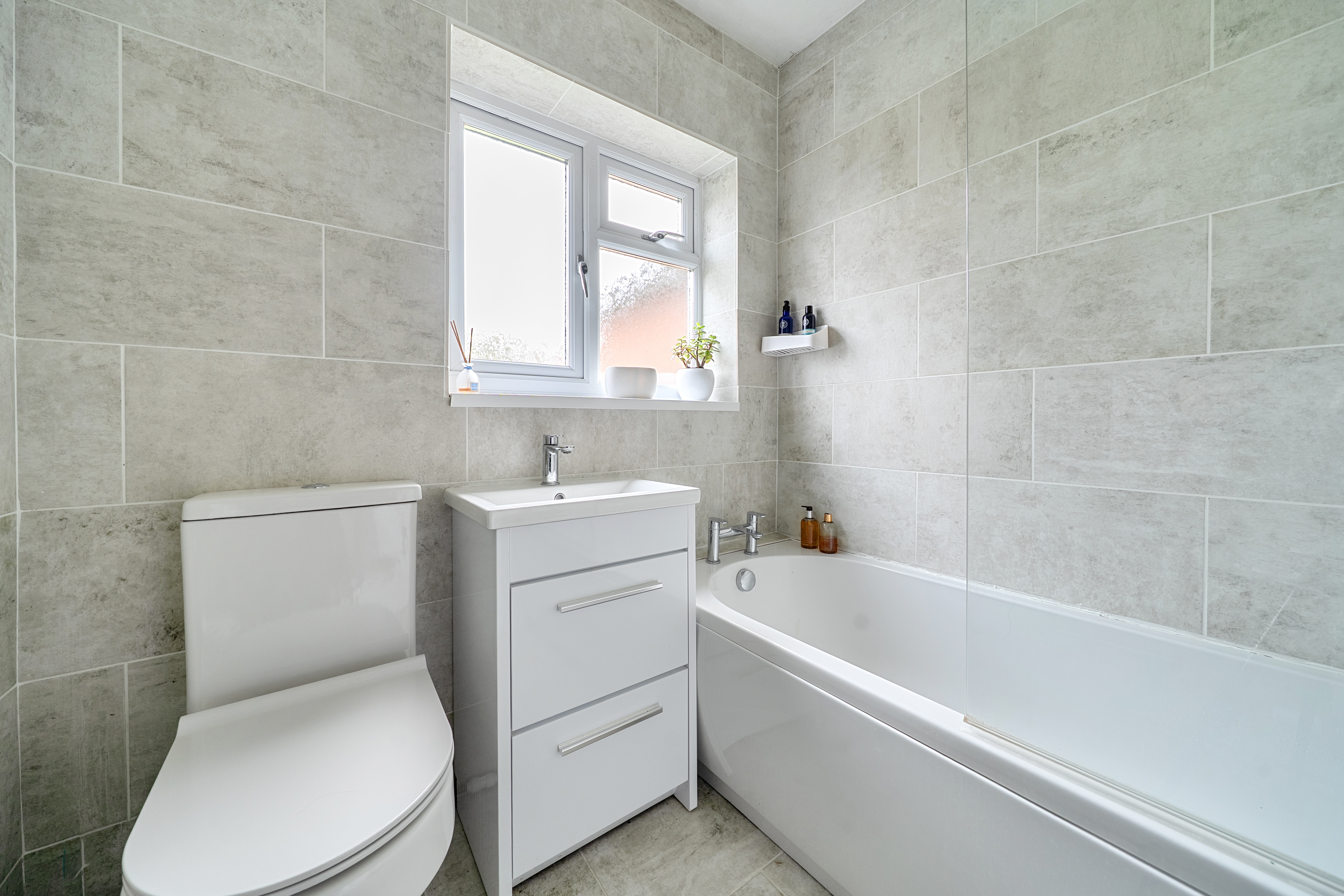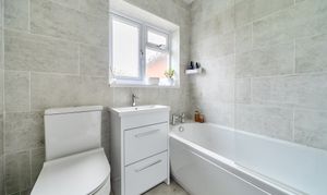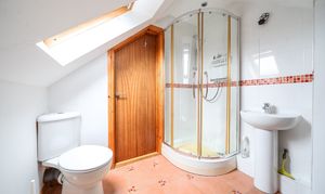 On the ground floor are two well-proportioned bedrooms, one benefiting from a built-in wardrobe, along with a family bathroom suite with an over-bath shower. Stairs lead to a further generous bedroom on the first floor, with an en-suite shower room.