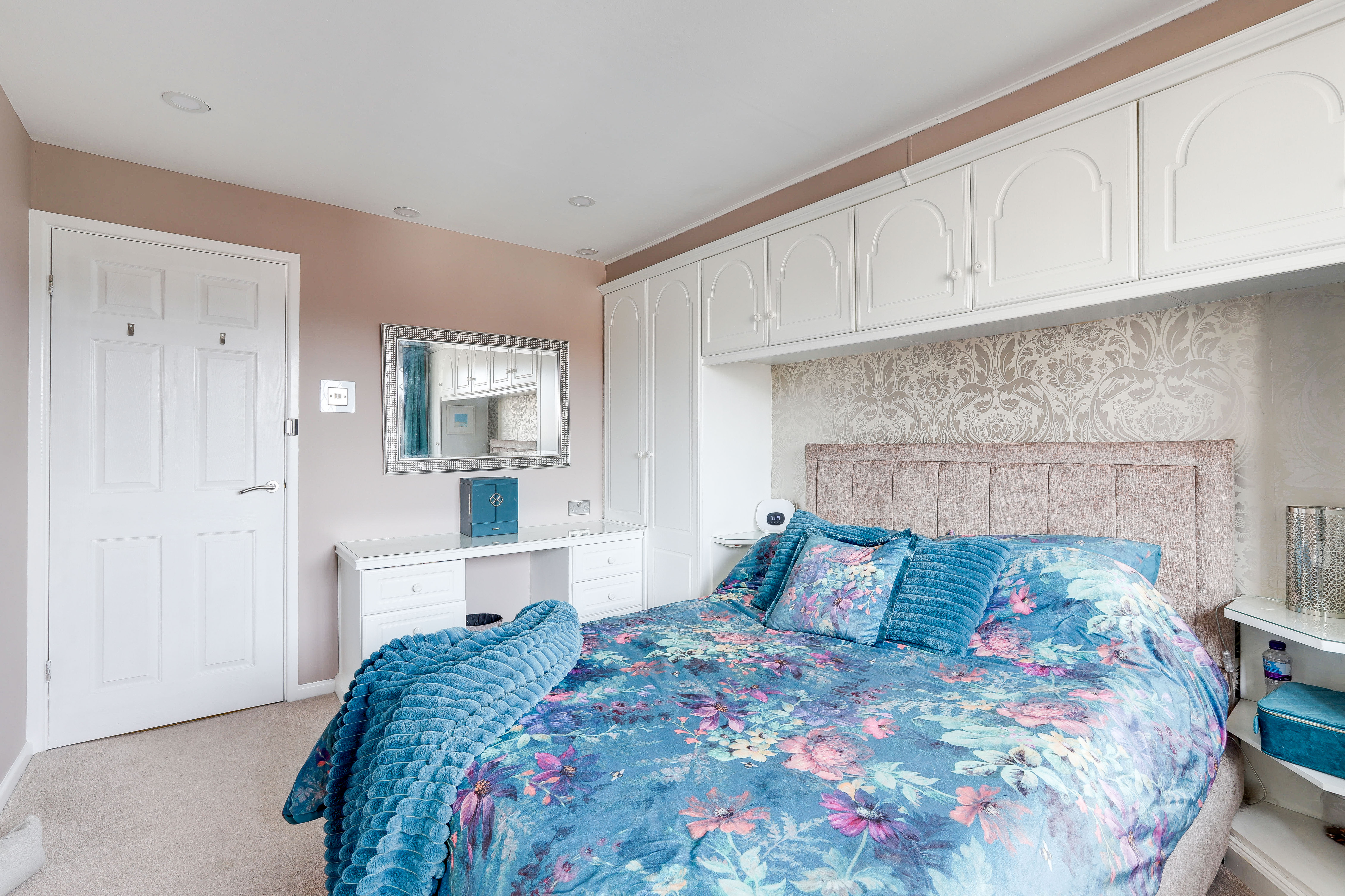 The main bedroom has carpeted flooring, a radiator, recessed spotlights, fitted wardrobes, an in-built sliding door wardrobe and a bow window to the front elevation.