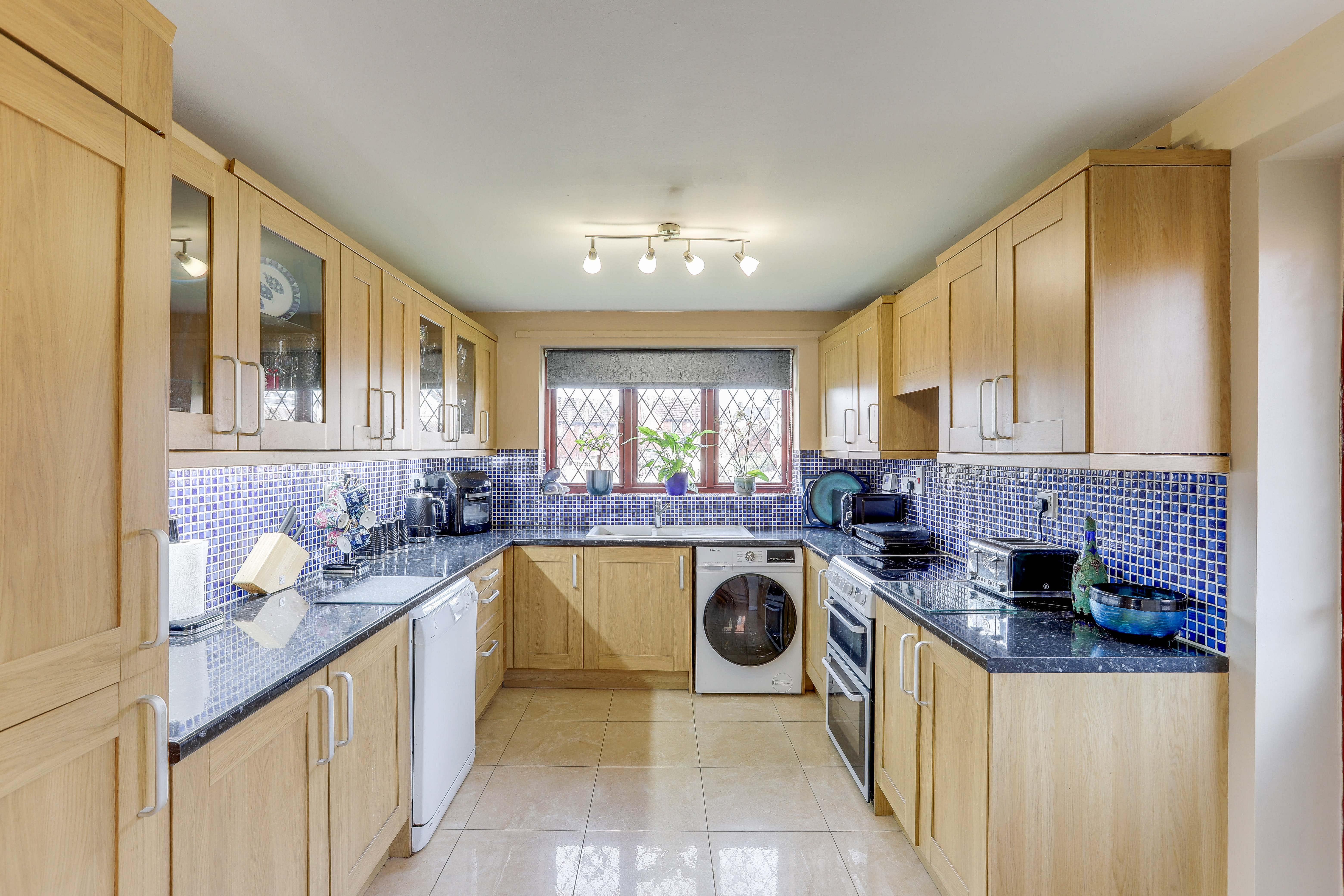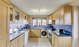 The kitchen has a range of fitted base and wall units with rolled-edge worktops, a sink and a half with a drainer and a mixer tap, space for a cooker, washing machine and dishwasher, partially tiled walls, tiled flooring, a window to the front elevation and a single door providing access to the side of the property.