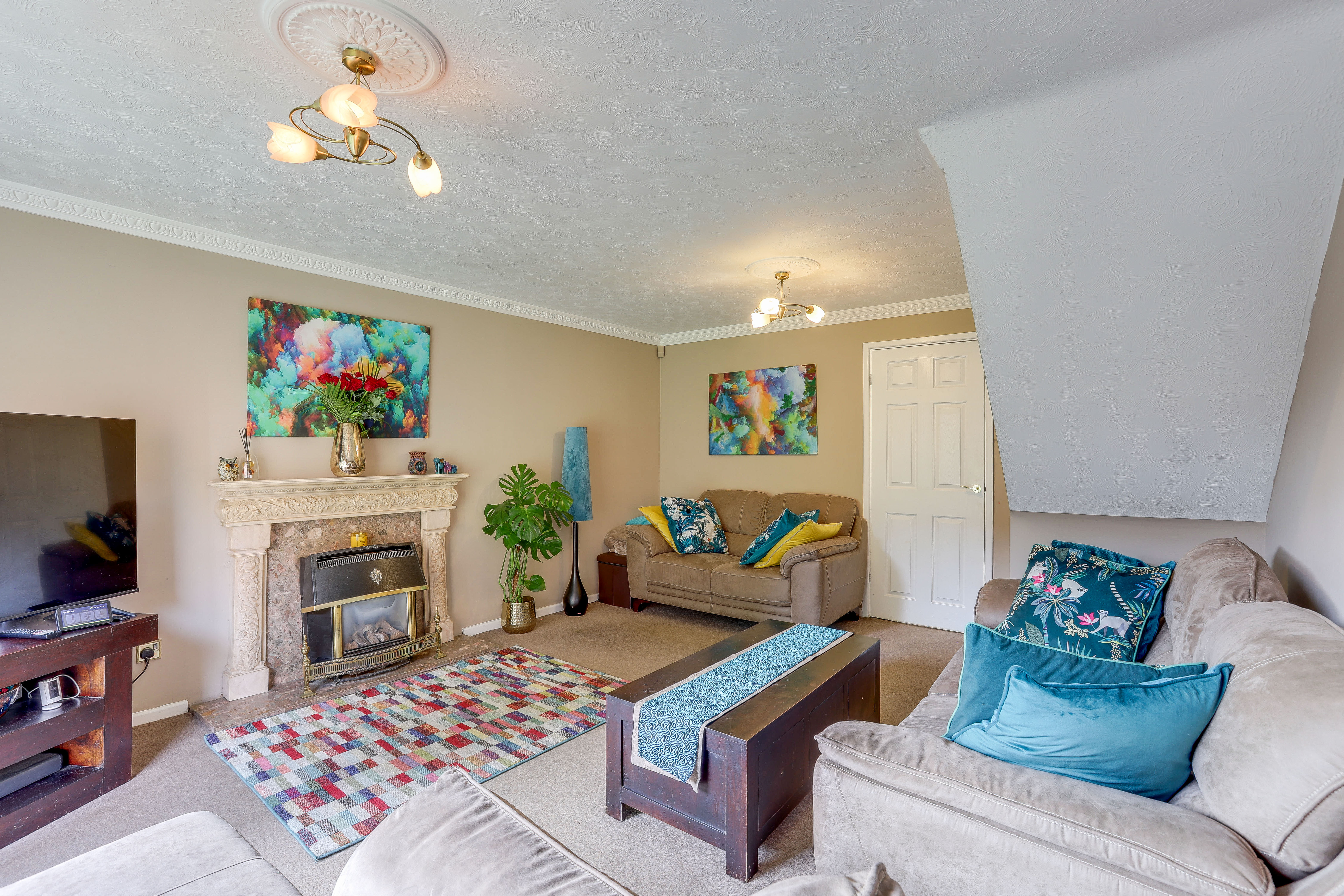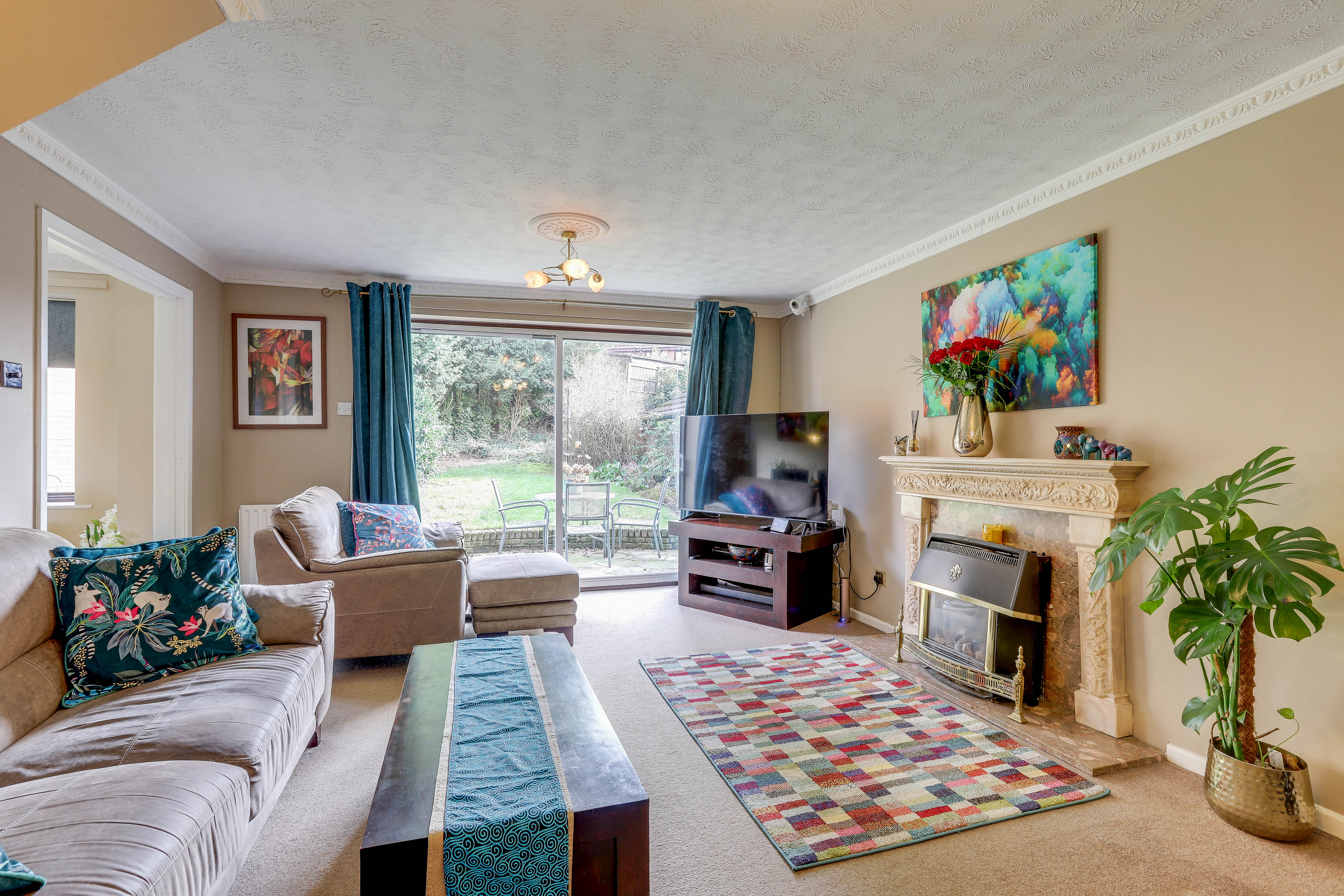 The living room has carpeted flooring, a radiator, ceiling coving, two ceiling roses, a feature fireplace and a sliding patio door opening out to the rear garden.
