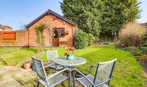 To the rear of the property is an enclosed garden with a paved patio area, a lawn, a range of plants and shrubs and fence panel boundaries.