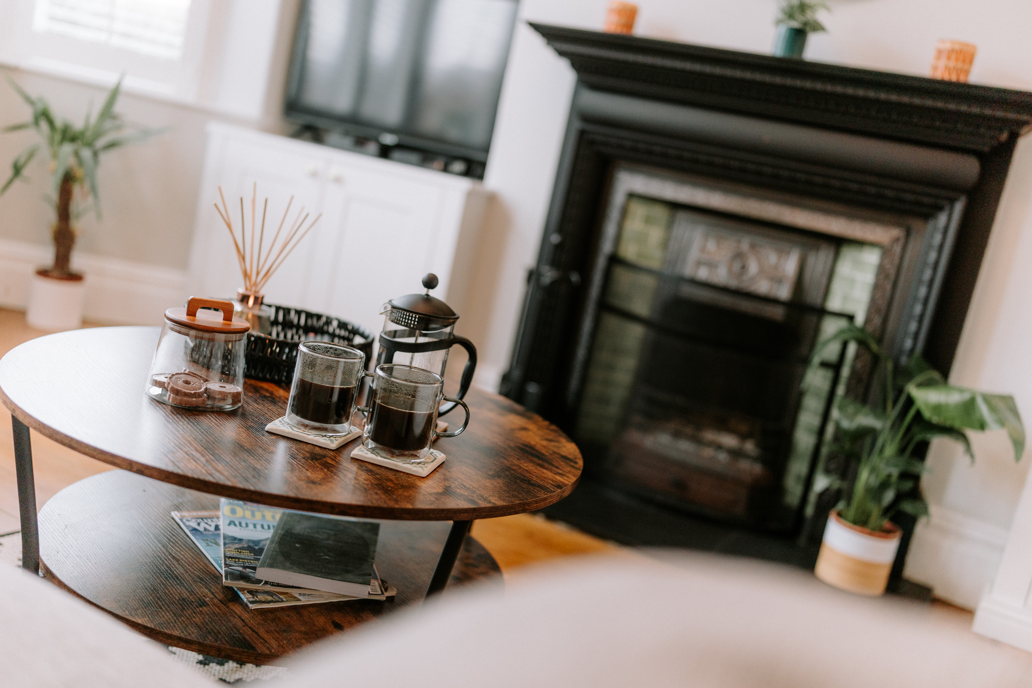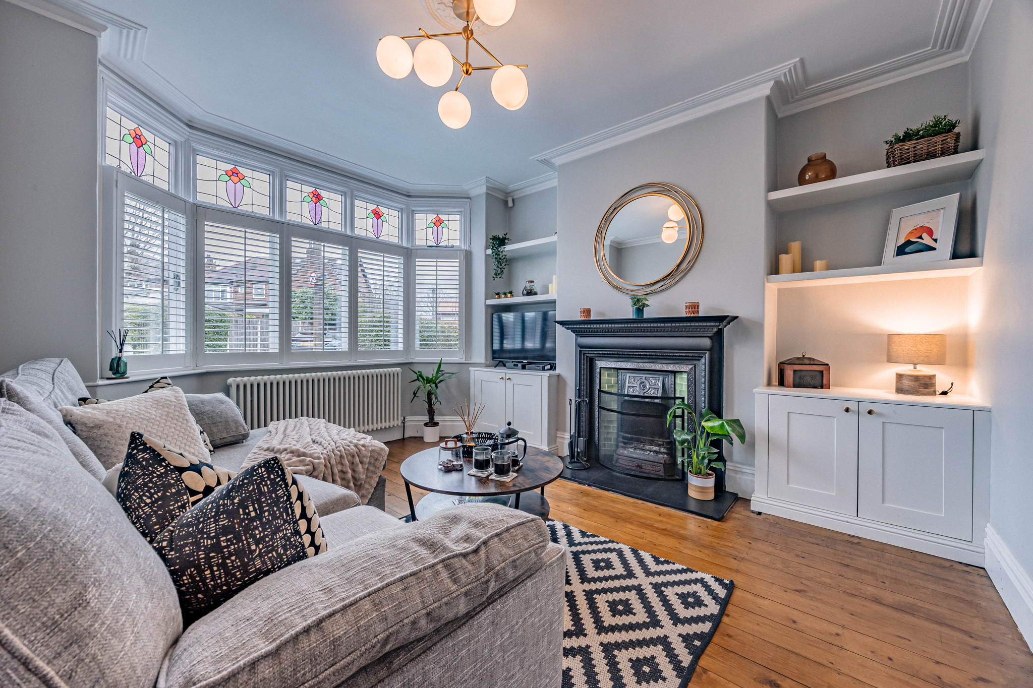 - Elegant front lounge with bay window, plantation shutters, exposed floorboards, and original cast-iron fireplace