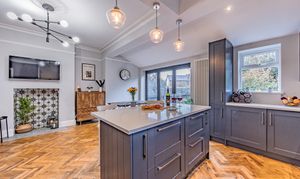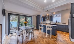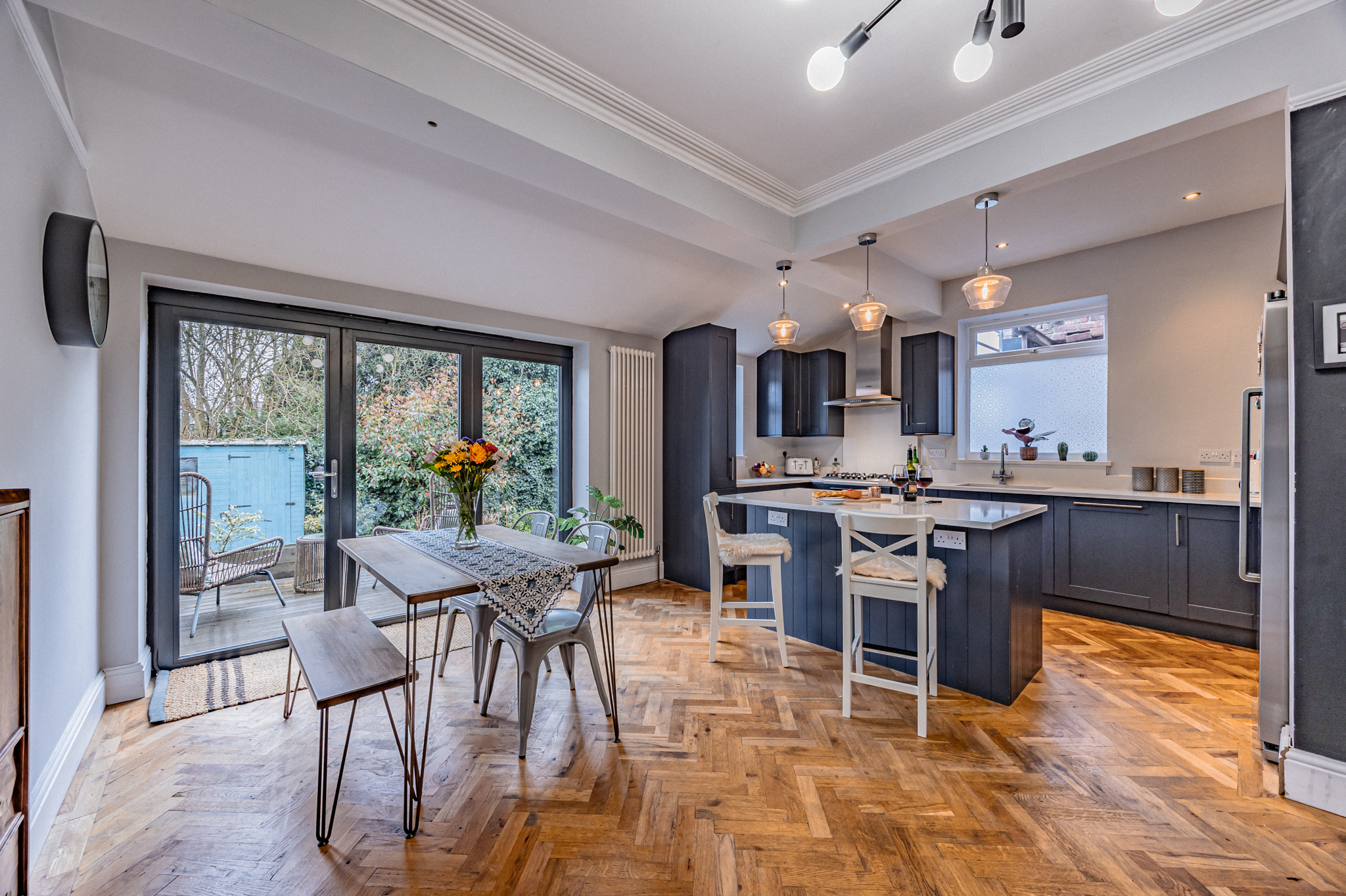 - Open-plan kitchen, diner and living area with central island, quality integrated appliances, and bifold doors opening to the garden