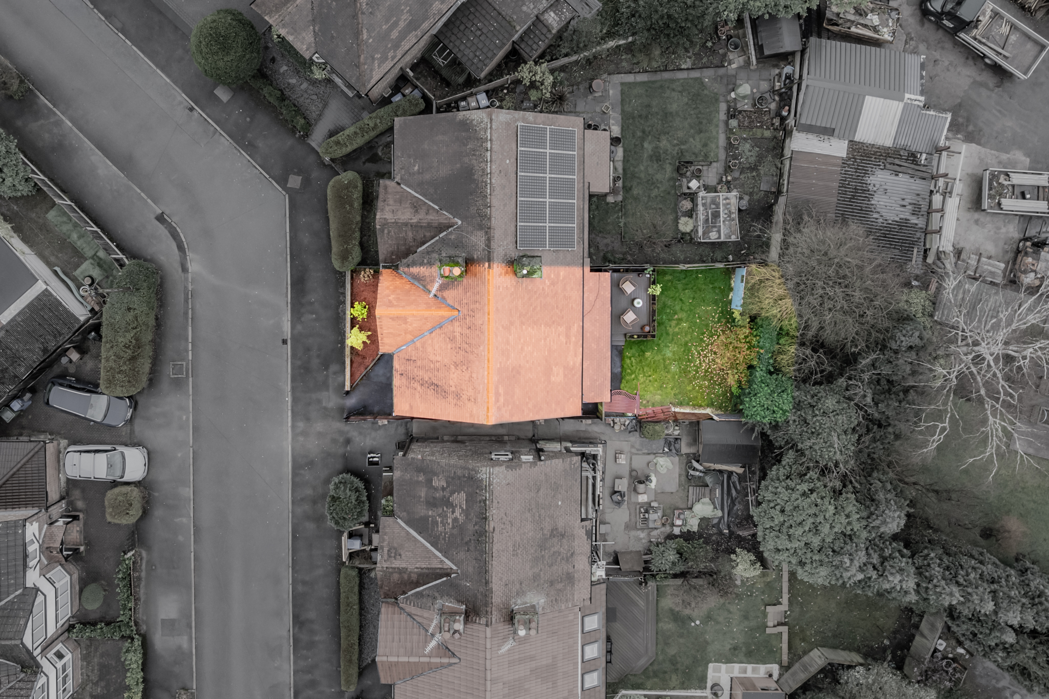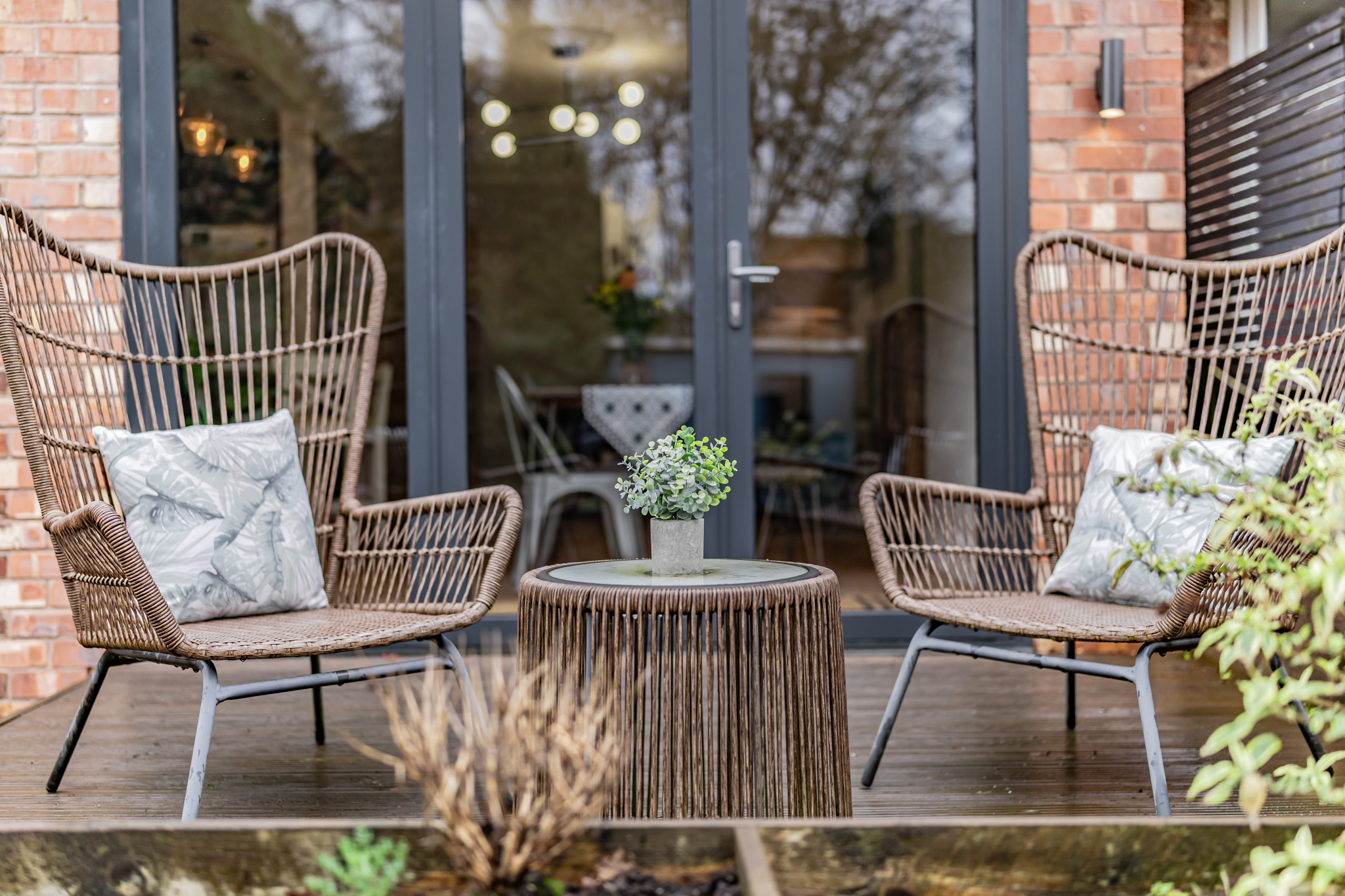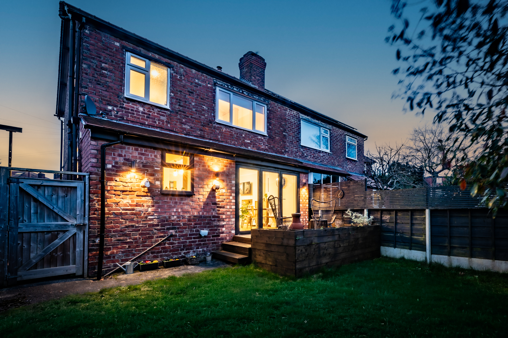 - Private rear garden with raised decked seating area, mature planting, secure side access, and not overlooked