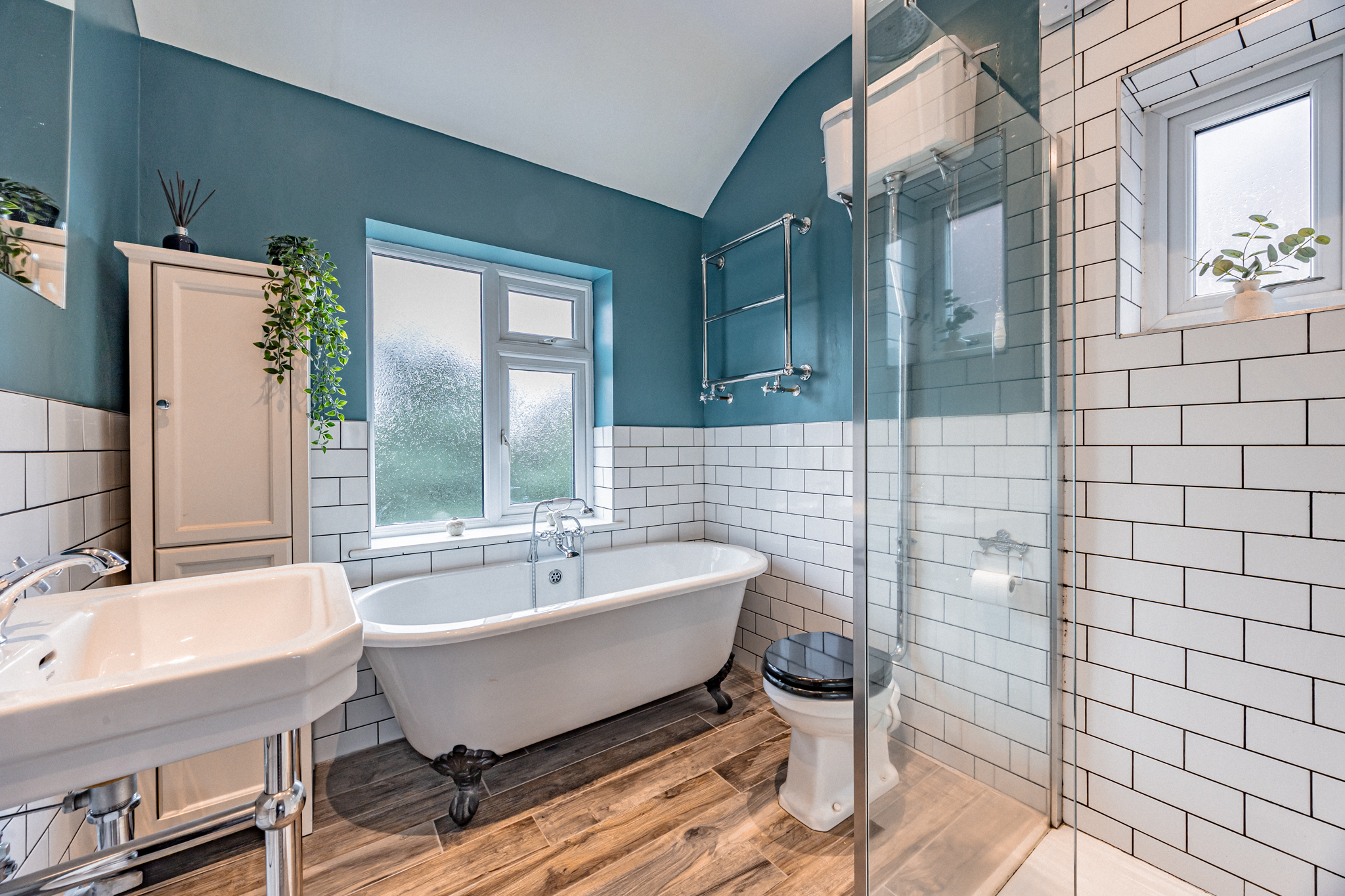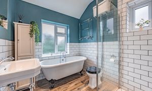 On the first floor, the main bathroom is stunning. With a three piece suite including a walk-in, rain head shower, a modern freestanding clawfoot bath and LVT flooring with a wood-effect finish .