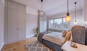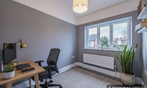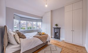 The principal bedroom is located at the front of the home and features a large bay window with double-glazed timber frames, a ceiling rose, and an original cast-iron fireplace. Bedroom two enjoys original wooden flooring, high ceilings with a picture rail, fitted wardrobes extending from floor to ceiling, and a large window overlooking the garden. A third bedroom, currently ideal as a study or guest room, also retains its original wood flooring.