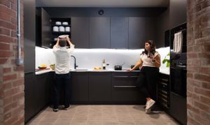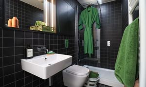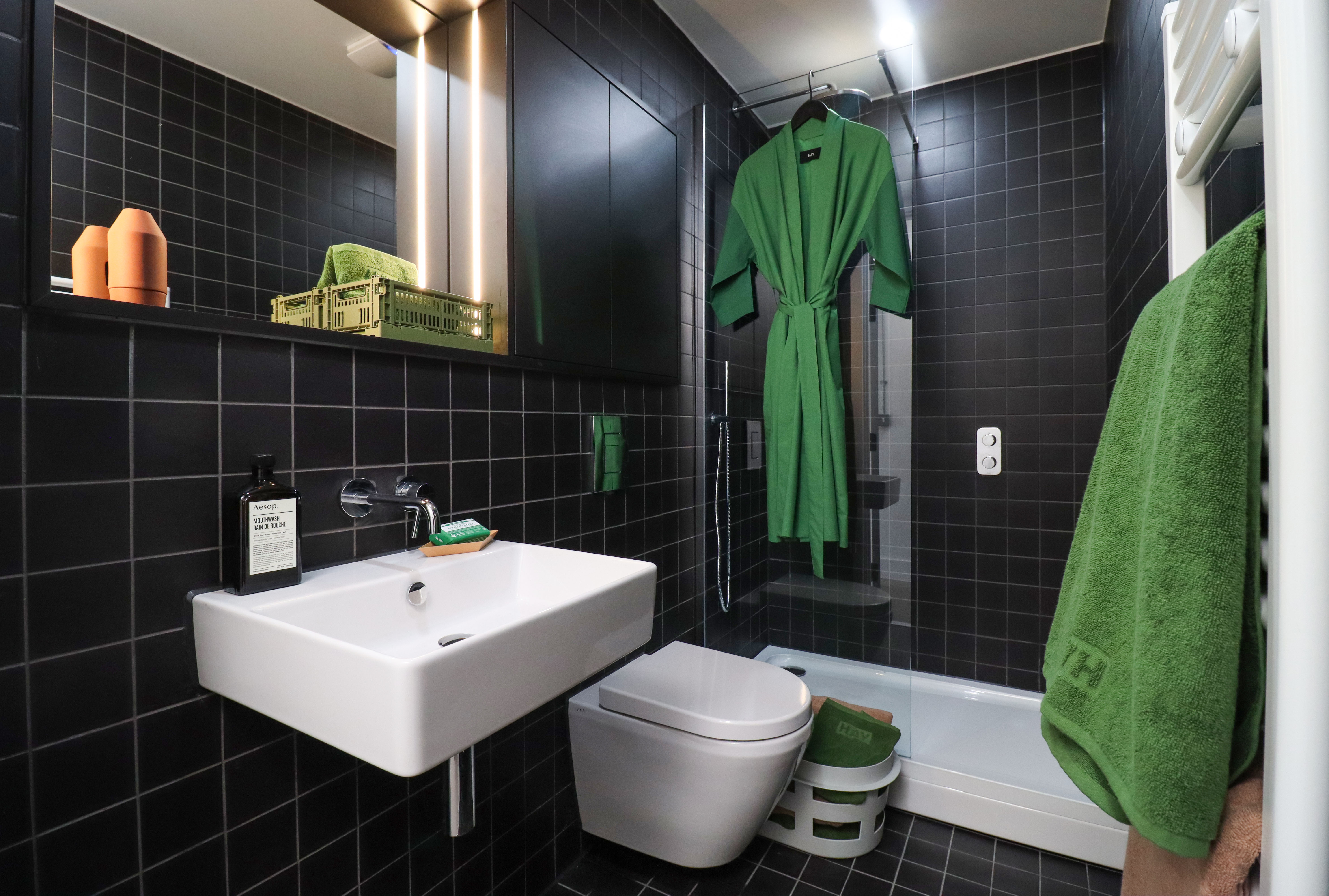 With exposed concrete features and piping, Urban Pads are packed with character. Open plan living gives you more space to move and huge floor-to-ceiling windows soak the rooms in light. This home is fitted with a Stratus grey kitchen with black Dekton worktop and splashback with Bosch appliances, including induction hob, oven, dishwasher, fridge freezer and microwave. The bathroom has matt black wall and floor tiles with black trim.