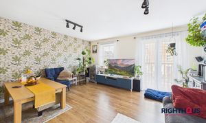 A generous living room area which features a Juliet balcony and laminated floor covering.