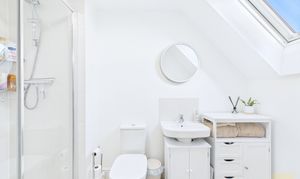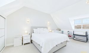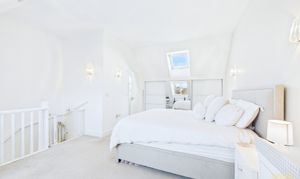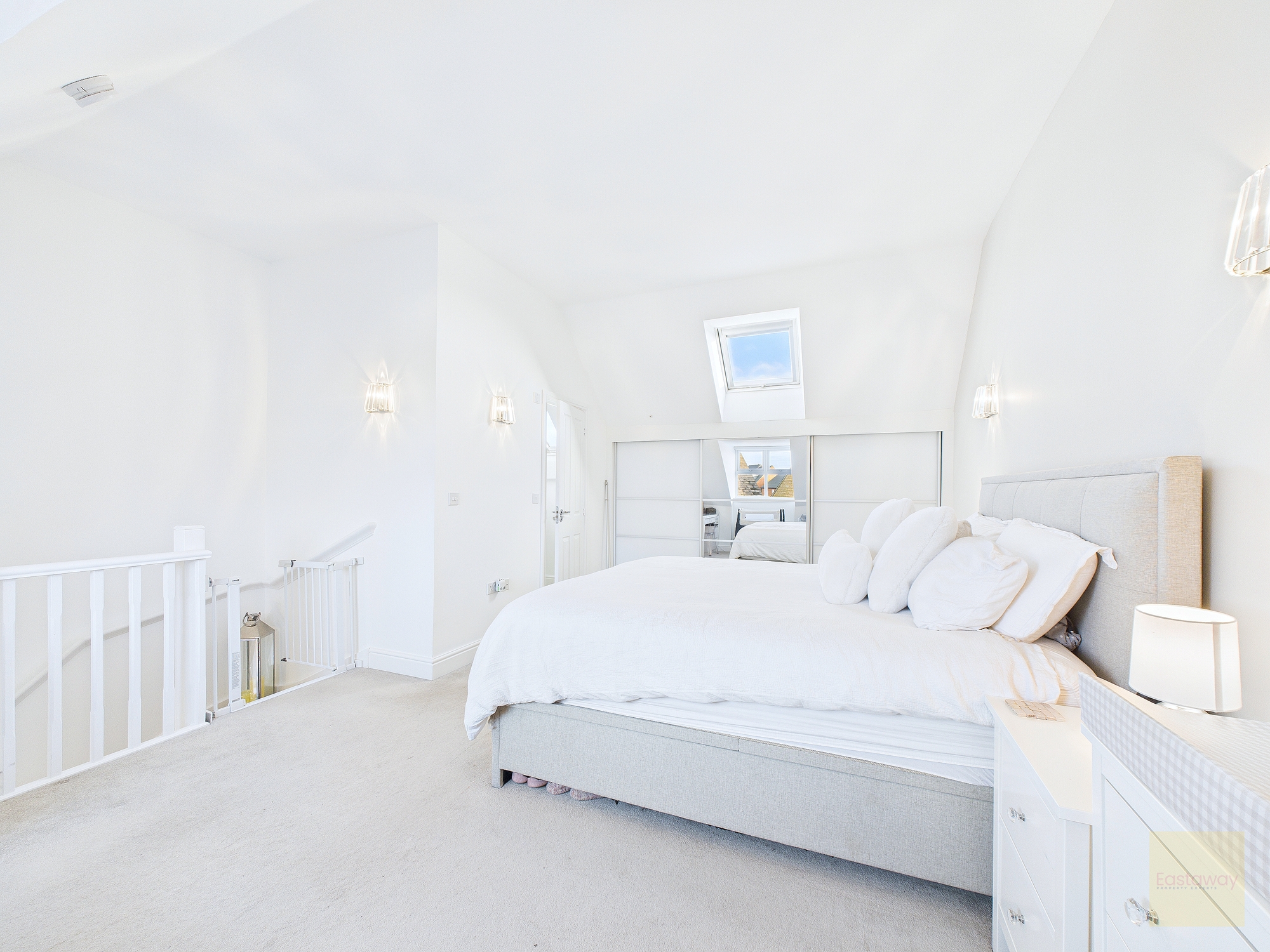 The principal bedroom occupies its own level, creating a proper retreat away from the rest of the house. It’s a beautifully sized space with built in wardrobes and a sleek en suite, and it feels calm, private, and luxurious. The owners talk about winter evenings up here, moonlight coming through the Velux window, book in hand, bedside lamp on, and you can immediately picture it. It’s the kind of room that makes slow mornings and early nights feel like a daily essential rather than a rare luxury.