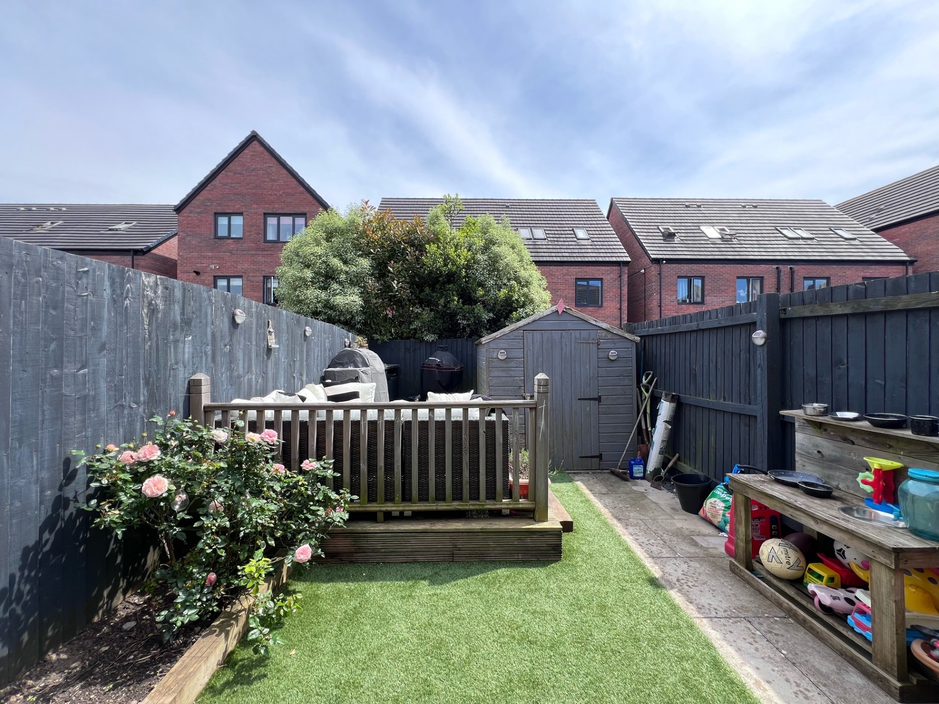 A Southerly aspect rear garden, fully enclosed, with gate to side. Patio area with tap. Artificial lawn, bordered flower beds plus a decked seating area. Shed.