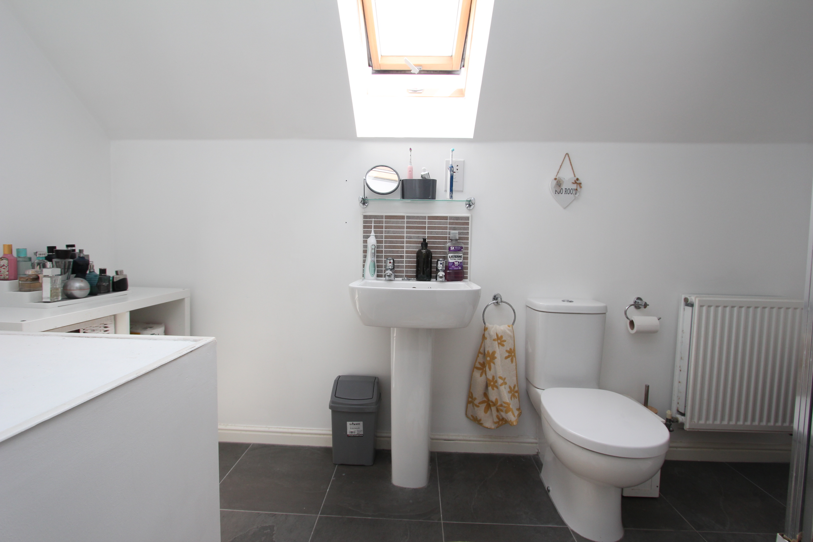 A spacious modern en suite with shower cubicle (thermostatic inset shower) pedestal basin and close coupled WC with button flush. Velux window and radiator. Tiled effect laminate floor.