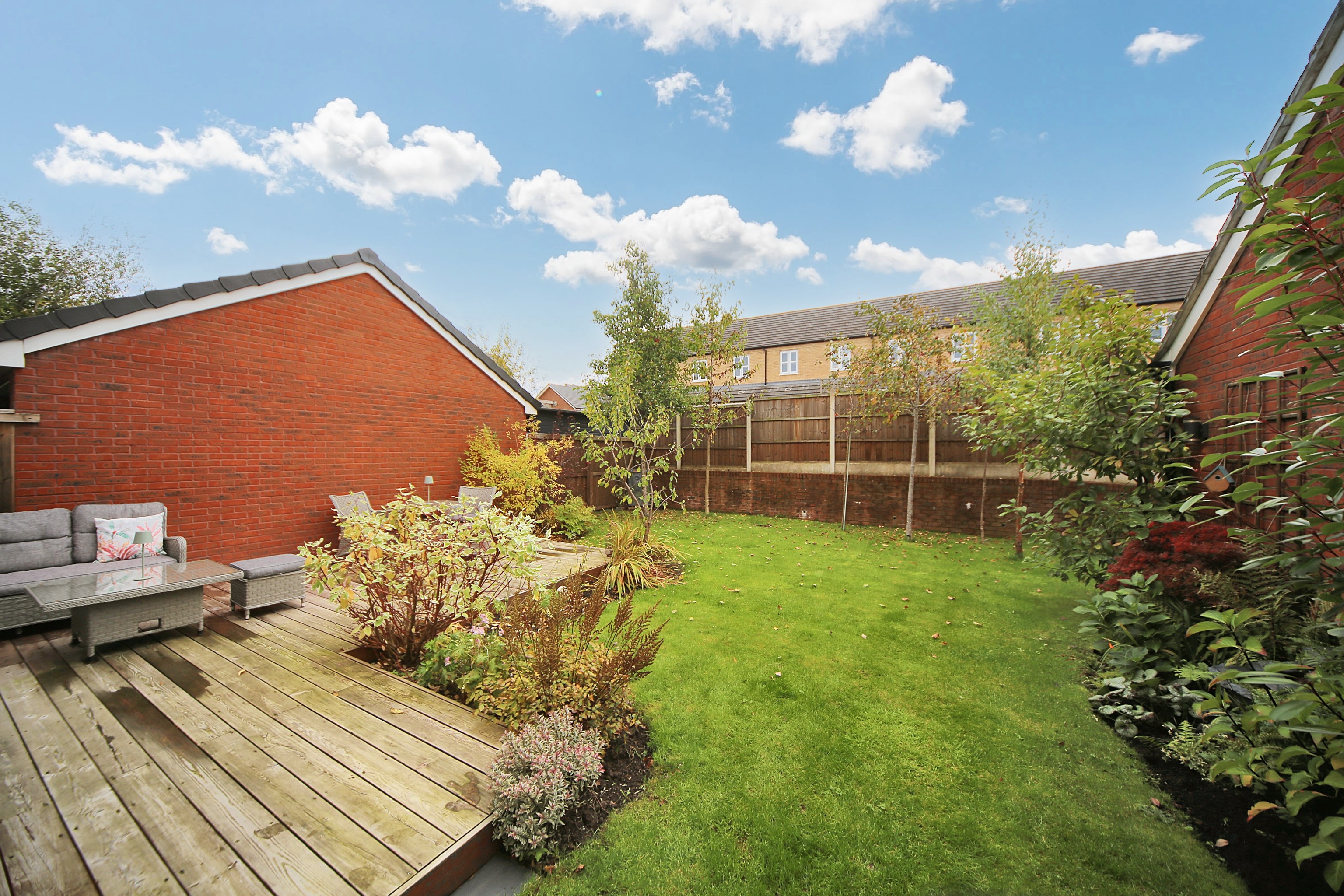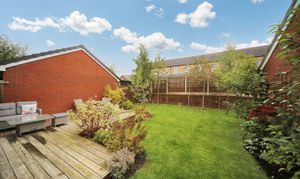 The garden has been beautifully landscaped with decking, a lawn, and planted borders, providing an ideal spot for relaxing or hosting family gatherings.