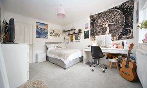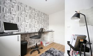 Upstairs, the master bedroom benefits from built-in furniture and a stylish en-suite shower room. The second bedroom also includes fitted wardrobes, while the third is another generous double. The fourth bedroom is currently fitted with a desk and drawers, making it the perfect home office or study space.