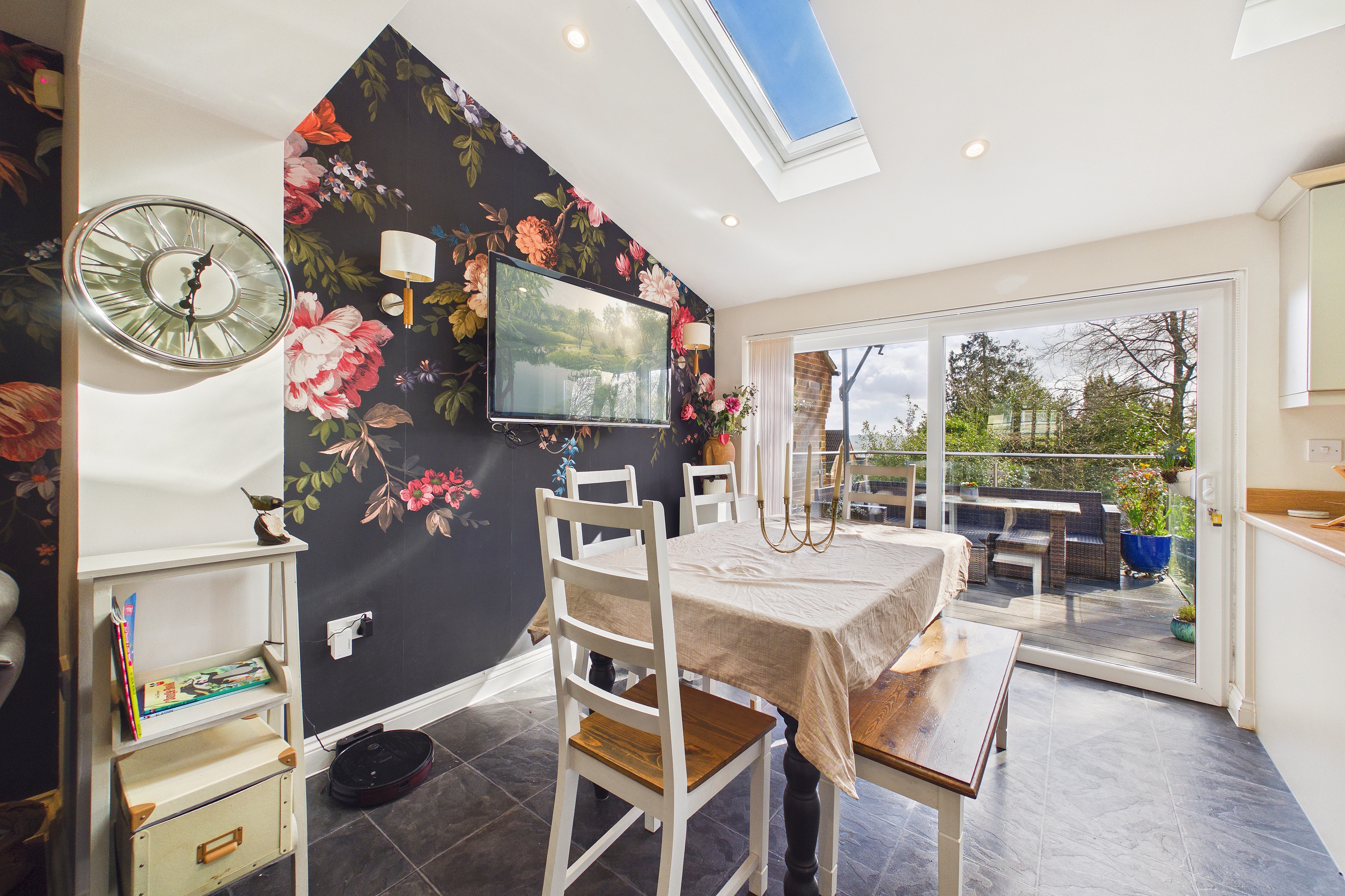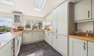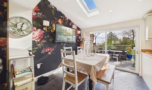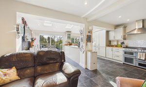 The house has been thoughtfully enlarged to create a layout that works particularly well for modern family life. At the heart of the home is a large open plan kitchen, dining and family space to the rear, with a partly vaulted ceiling and roof windows bringing in plenty of natural light. Wide sliding doors open directly onto the south facing garden terrace, creating a natural connection between the inside and outside spaces. The kitchen is fitted in a classic shaker style with good storage and worktop space, complemented by a log burner that adds warmth and character to the room. Alongside the main living area there is a separate living room with feature fireplace, providing a quieter place to relax, while an additional room offers useful flexibility as a study, games room or hobby space. A utility room and cloakroom complete the ground floor accommodation.