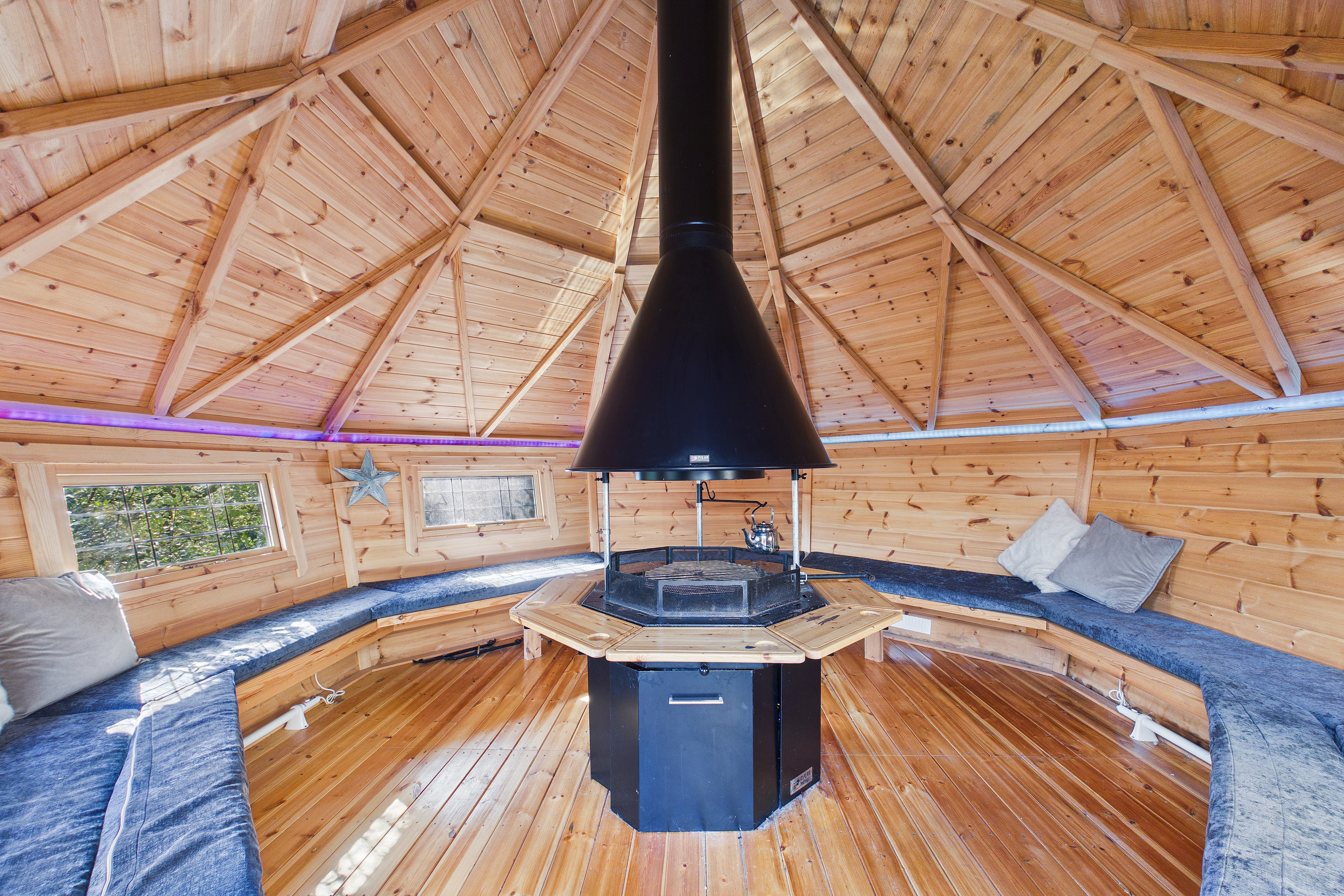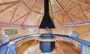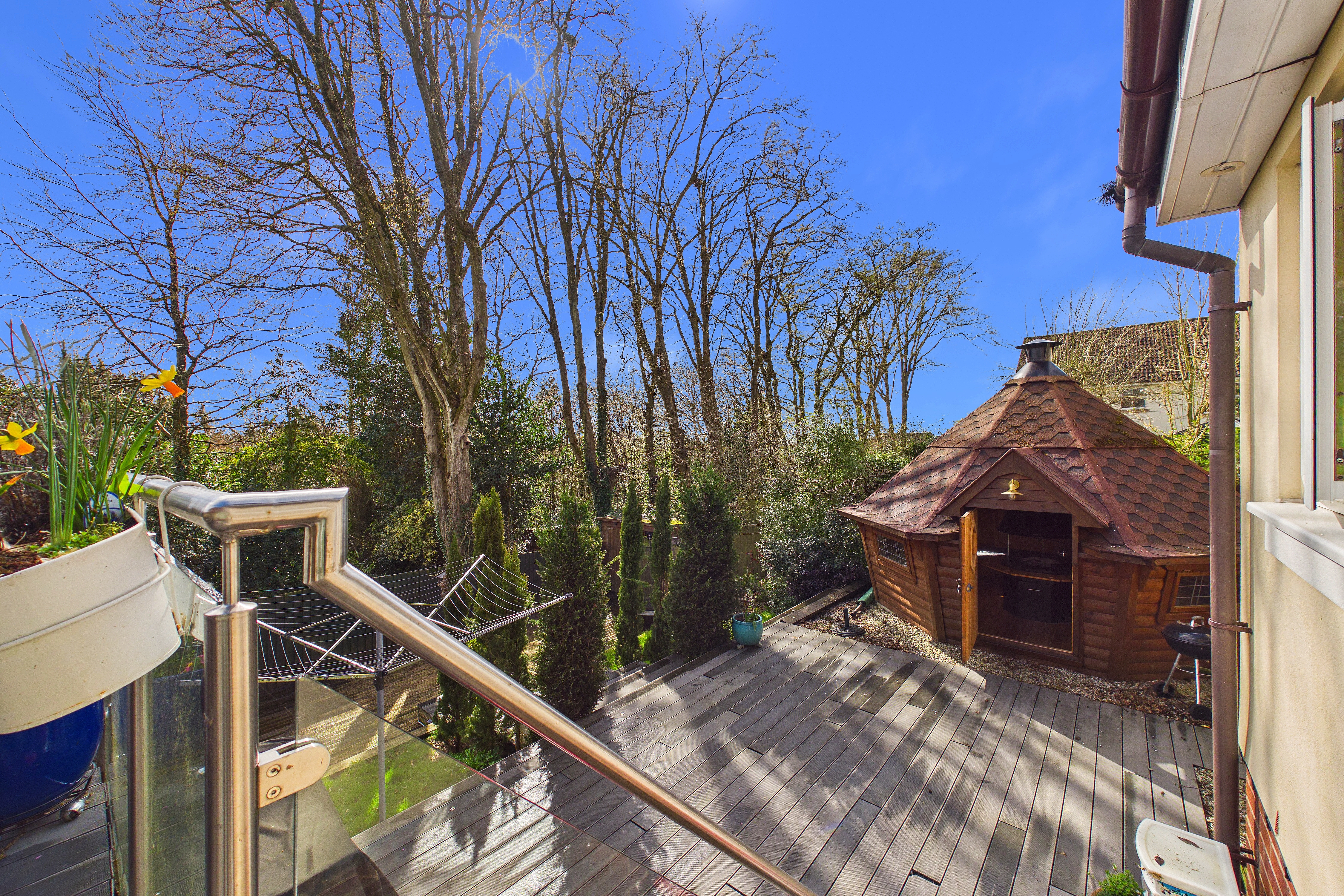 Outside, the south-facing garden has been carefully landscaped to create a series of inviting spaces. A large decked terrace sits directly outside the house, with steps leading down through planted borders to lawned areas below. A bespoke BBQ lodge with vaulted roof and central fire provides a striking focal point and offers a covered space for gatherings throughout the year, complemented by a hot tub and outdoor shower.