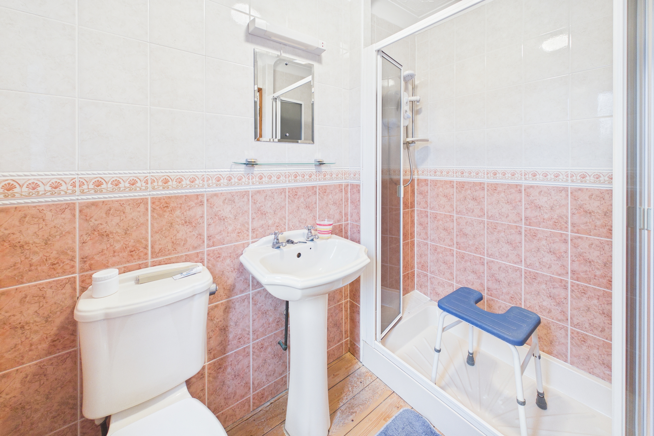 Frosted window to rear, shower cubicle with electric shower over, low level W/C, wash basin with individual taps over, with full wall tiling, radiator, and wood effect flooring.