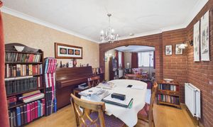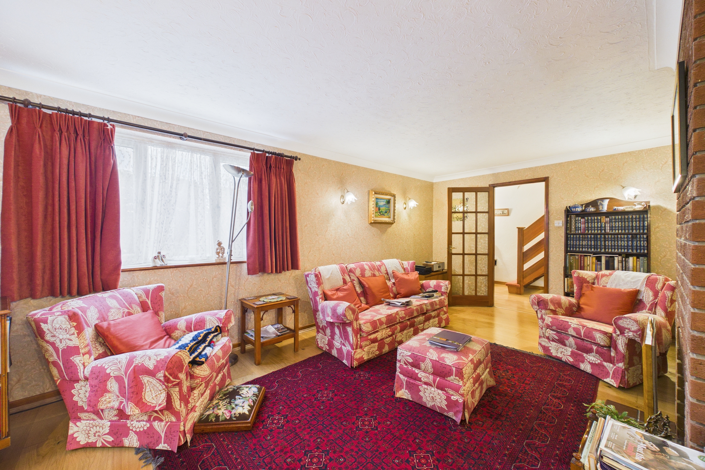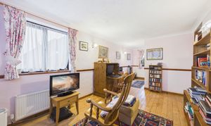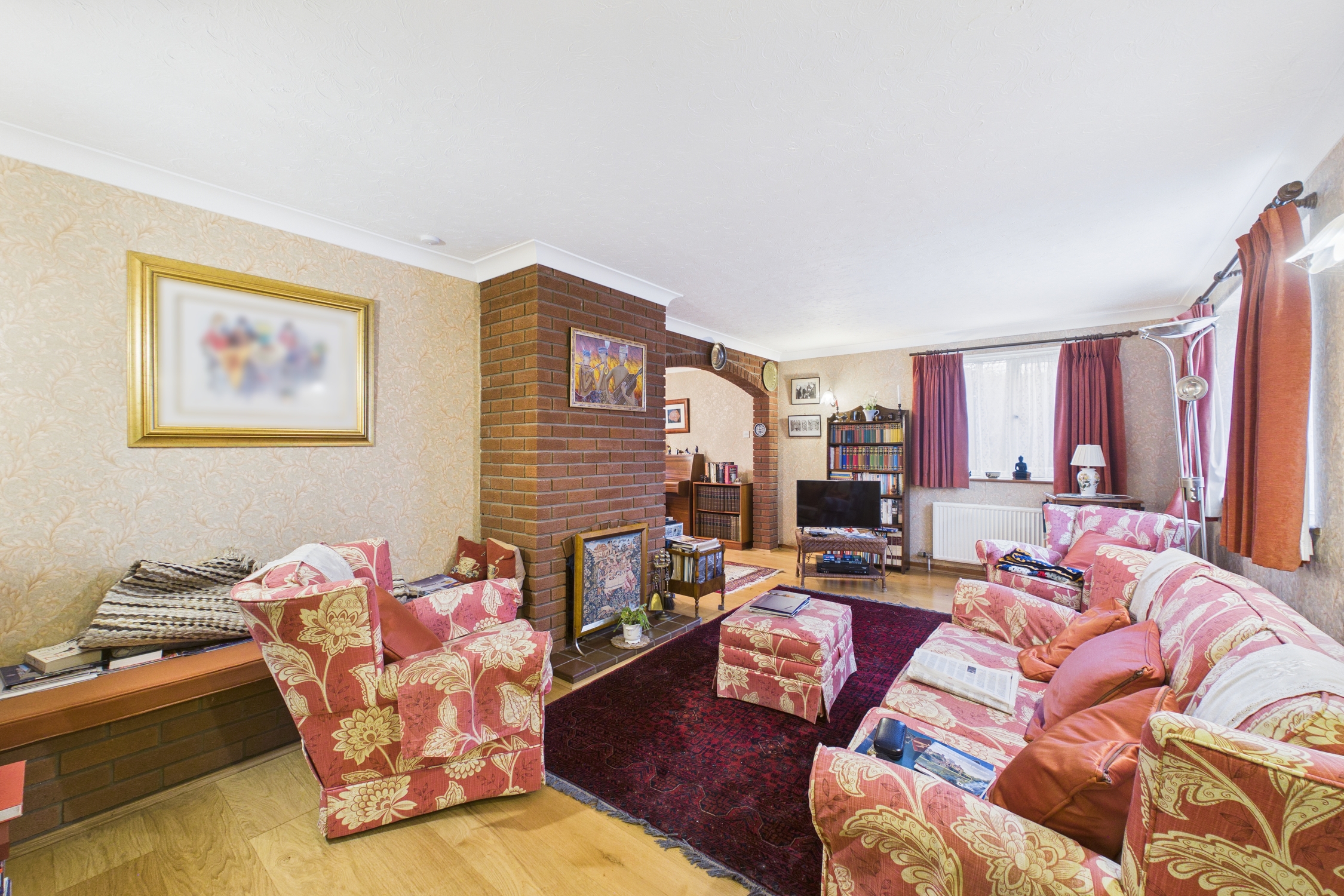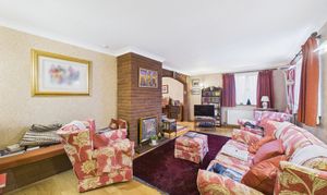 Windows to front and side, feature fire surround, with radiator, wooden flooring, and door returning to the entrance hallway.