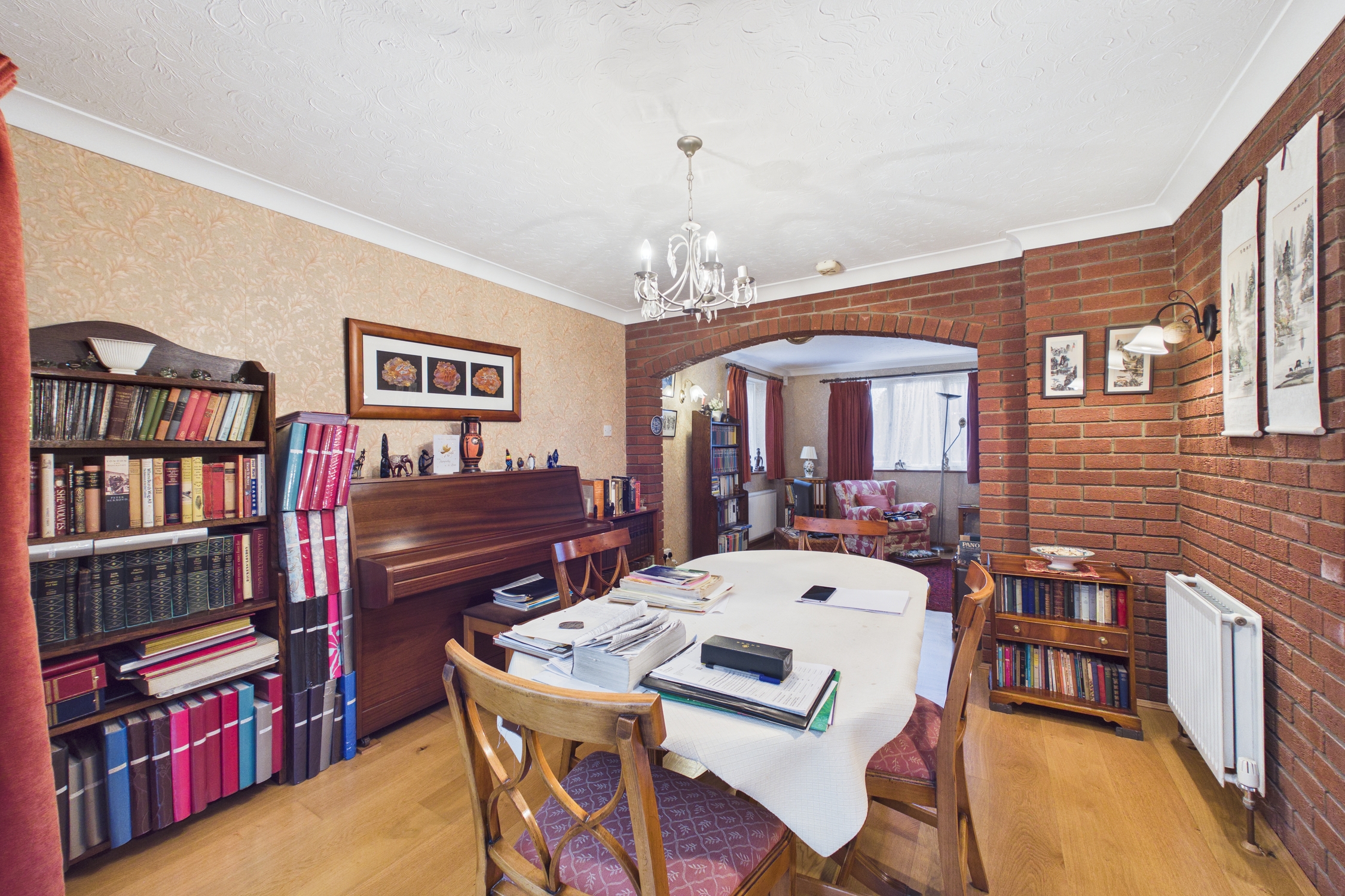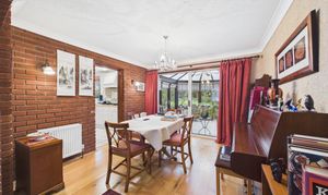 Patio door to conservatory, two radiators, with wooden flooring, and opening to lounge.