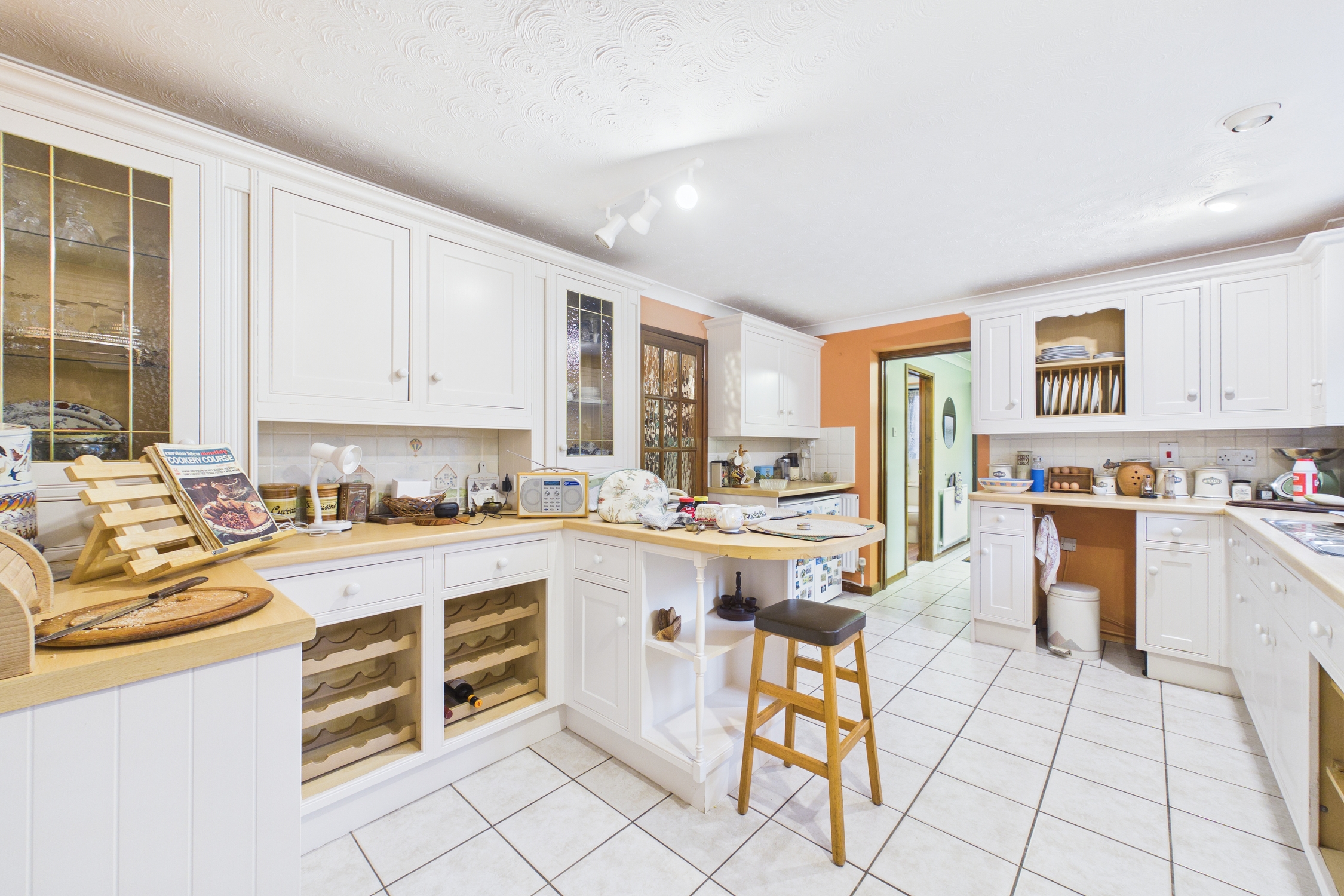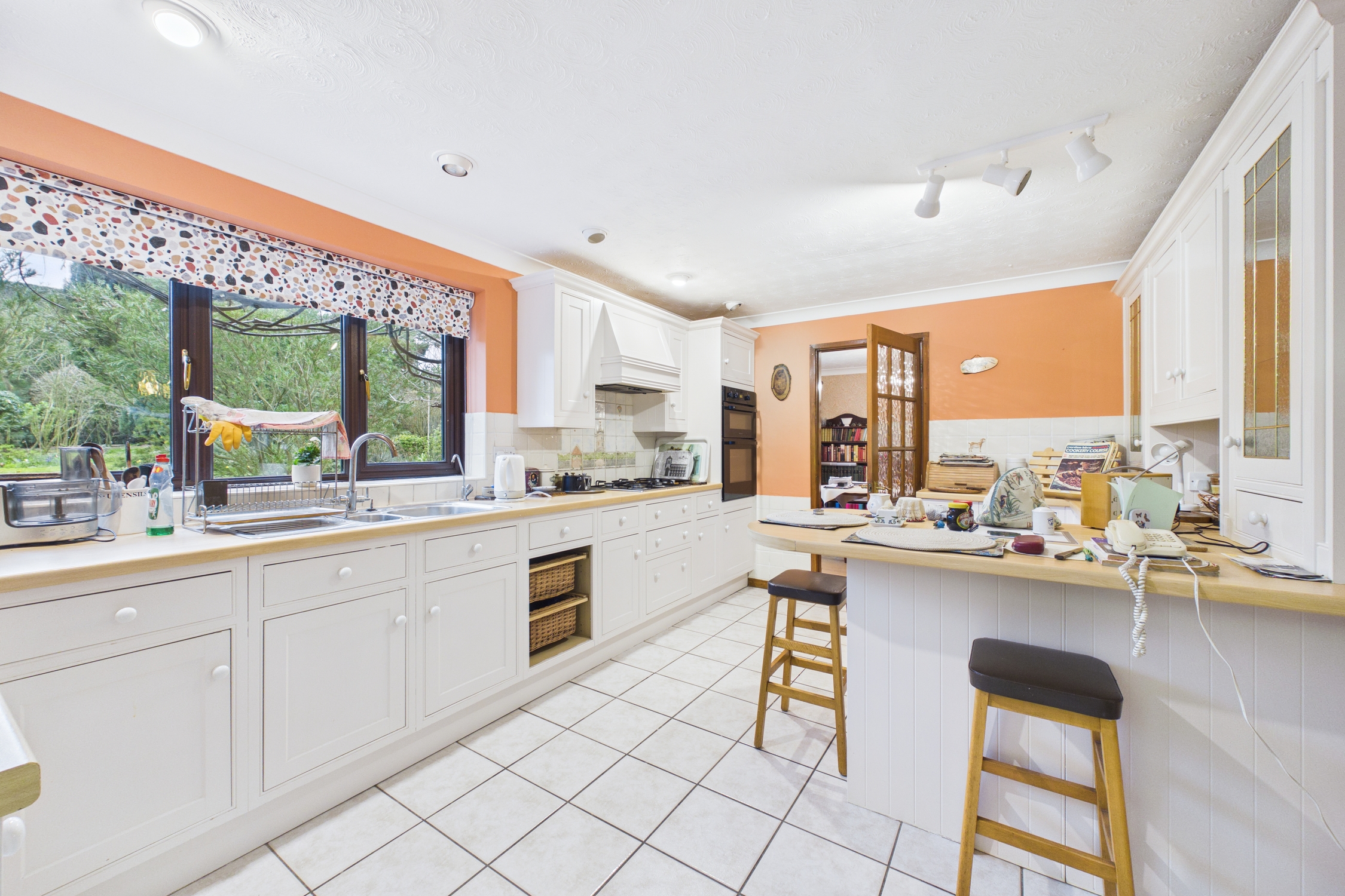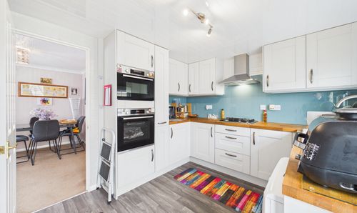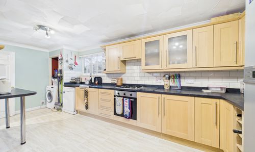 Window to rear, matching wall and base units with worktop over, inset 1.5 bowl sink unit with mixer tap over, tiled splashbacks, integrated electric oven and gas hob with cooker hood over, space for undercounter fridge and freezer, with radiator, tiled flooring, and doors to dining room and utility room.