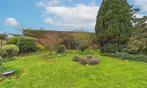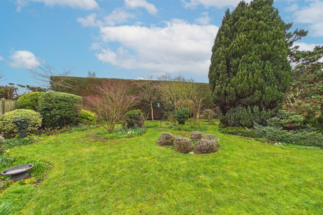 Mainly laid to lawn, patio area to the immediate rear of the property, small pond, mature shrubs, multiple trees, and large hedge to the rear, with two side access gates to the front of the property.