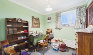 Windows to front, side, and rear, with two radiators, wood effect flooring, and door to en-suite.