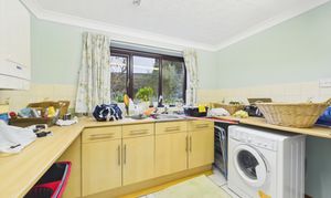 Window to rear, base units with worktop over, inset 1 bowl sink unit with individual taps over, tiled splashbacks, wall mounted gas fired boiler, space for undercounter washing machine, with radiator, tiled flooring, and doors to W/C and rear garden.