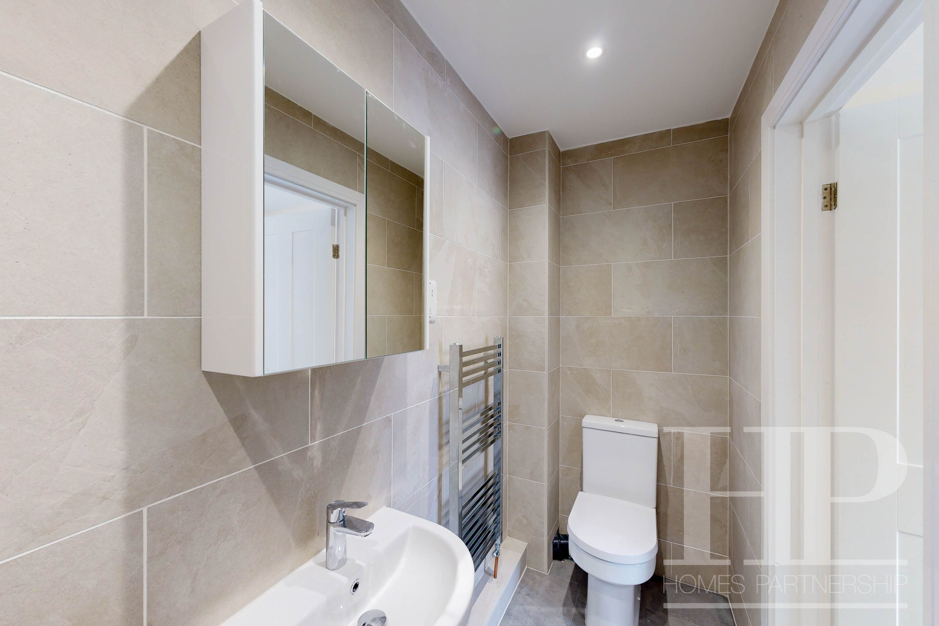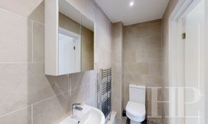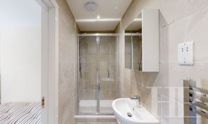 Large en-suite bathroom. Shower cubicle. Basin and low level WC. Wall-mounted cupboard with mirror fronted doors. Tiled flooring.