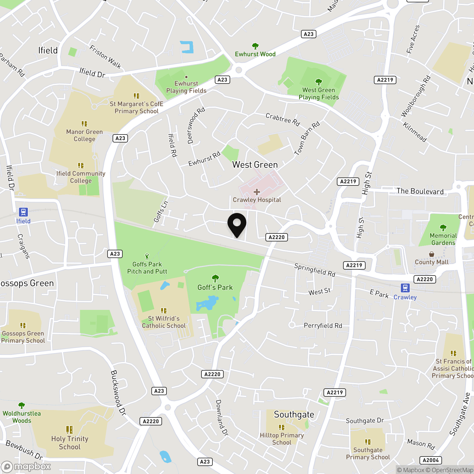 West Green was the first neighbourhood to be developed and is one of the smallest and closest to the town centre. Northgate and the town centre lie to the east of West Green, Southgate to the south, Ifield to the west and Langley Green to the north. West Green is home to Crawley Hospital, since the 1990s many services have been moved to East Surrey Hospital in Redhill and Crawley hospital has a sub-acute status. Crawley Fire Station is on the edge of West Green. The neighbourhood is served with a small parade of shops, a pub, primary school and church. The park offers a tranquil space to relax in yet is within walking distance of the town centre. Metro bus has routes through West Green and within walking distance is Crawley train station and all the facilities at Crawley Leisure Park including Hollywood Bowl, Cineworld multi-screen cinema, gym and swimming pool, and many restaurants including Bella Italia, Wagamama, Harvester and Nandos.