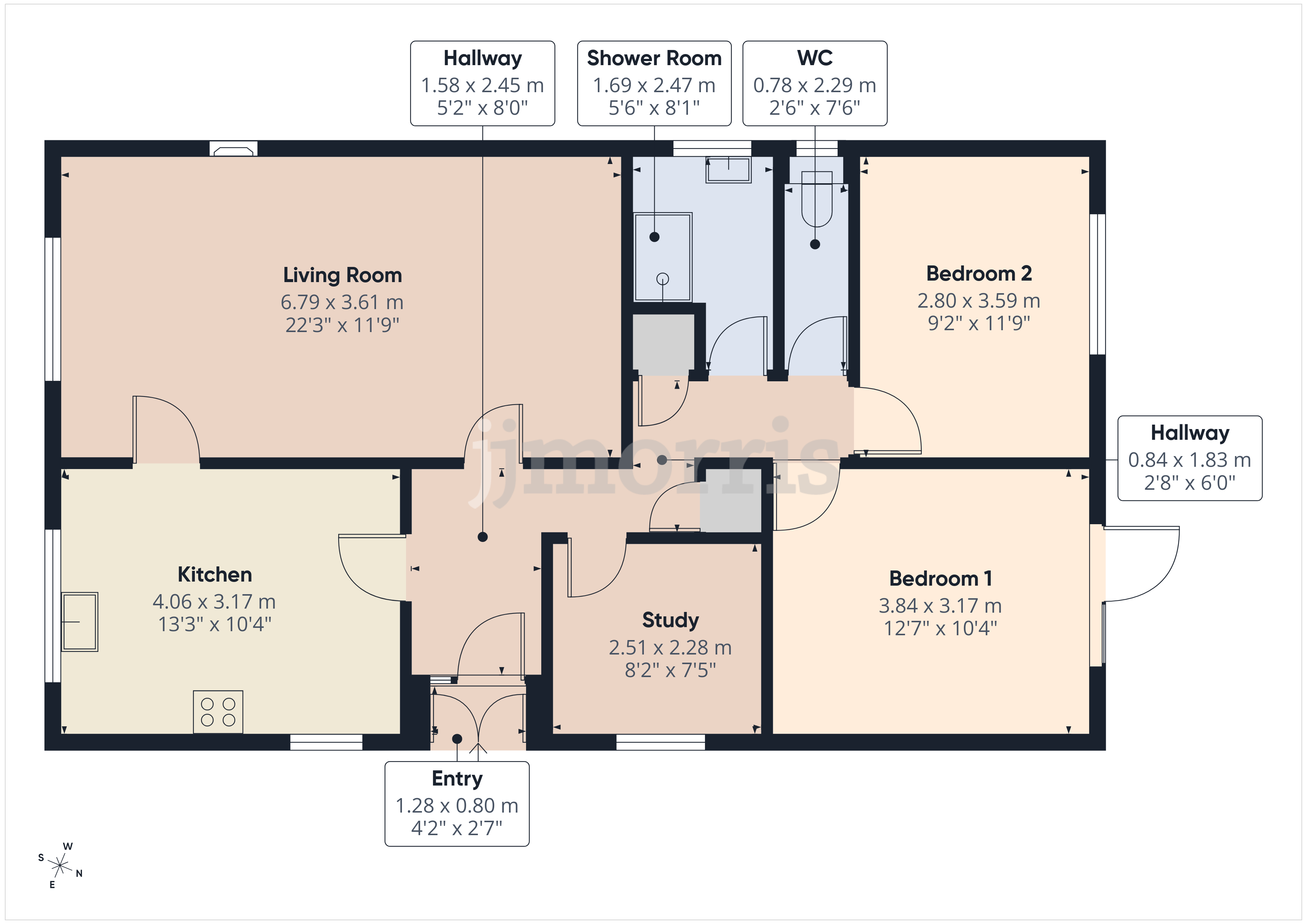 with 15 pane glass doors leading to the kitchen and the sitting room. The hallway progresses into the bedroom and bathroom accommodation and has a built-in store cupboard, loft access and radiator.