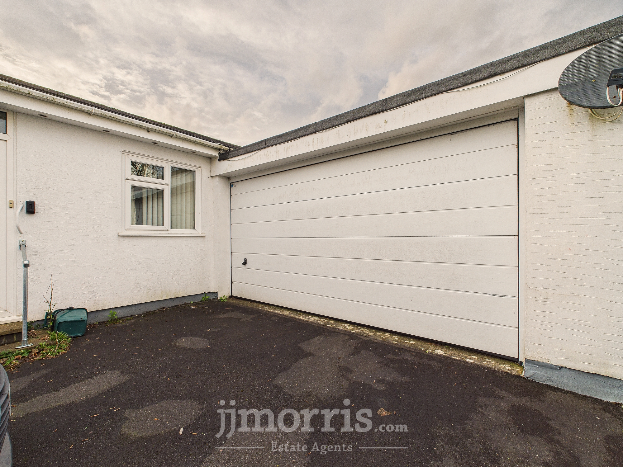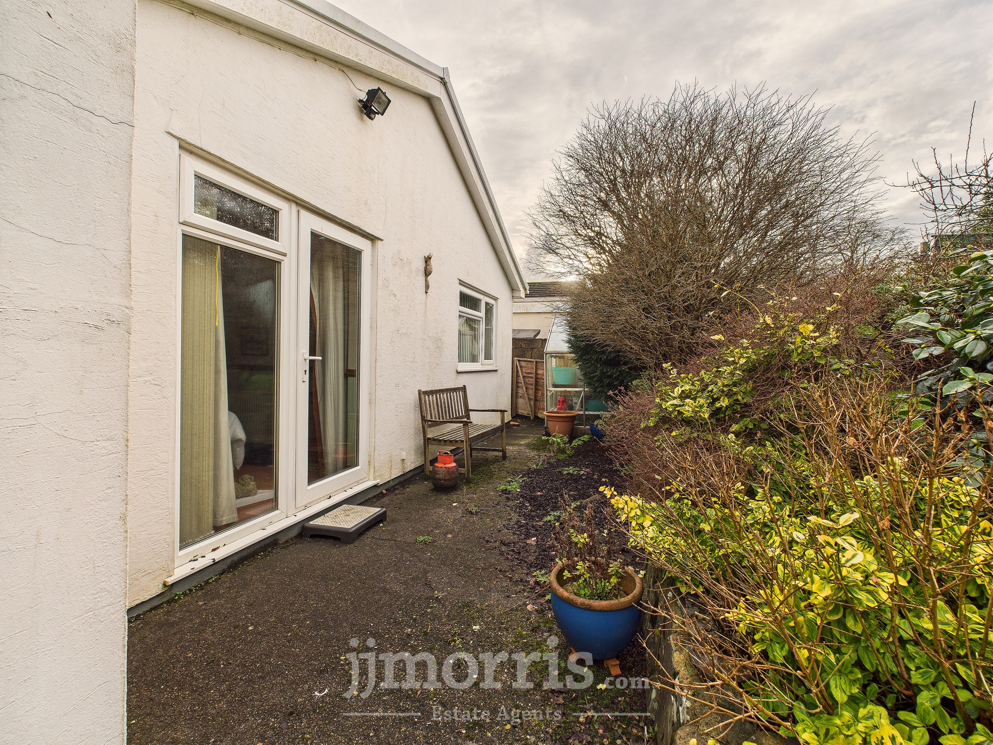 Set back from the road with front garden, driveway for 2–3 cars, single garage and low-maintenance rear garden with patio, lawn and greenhouse