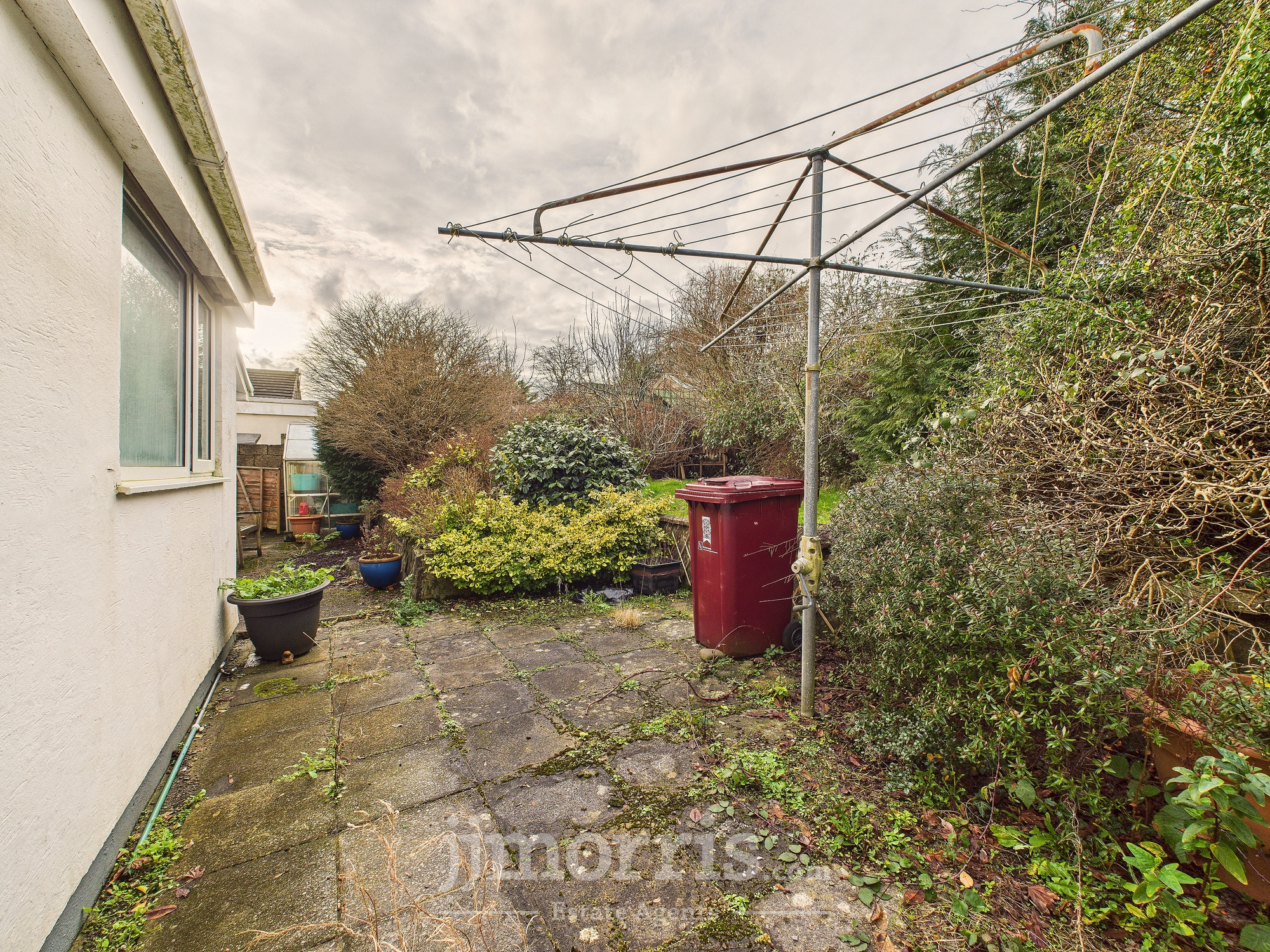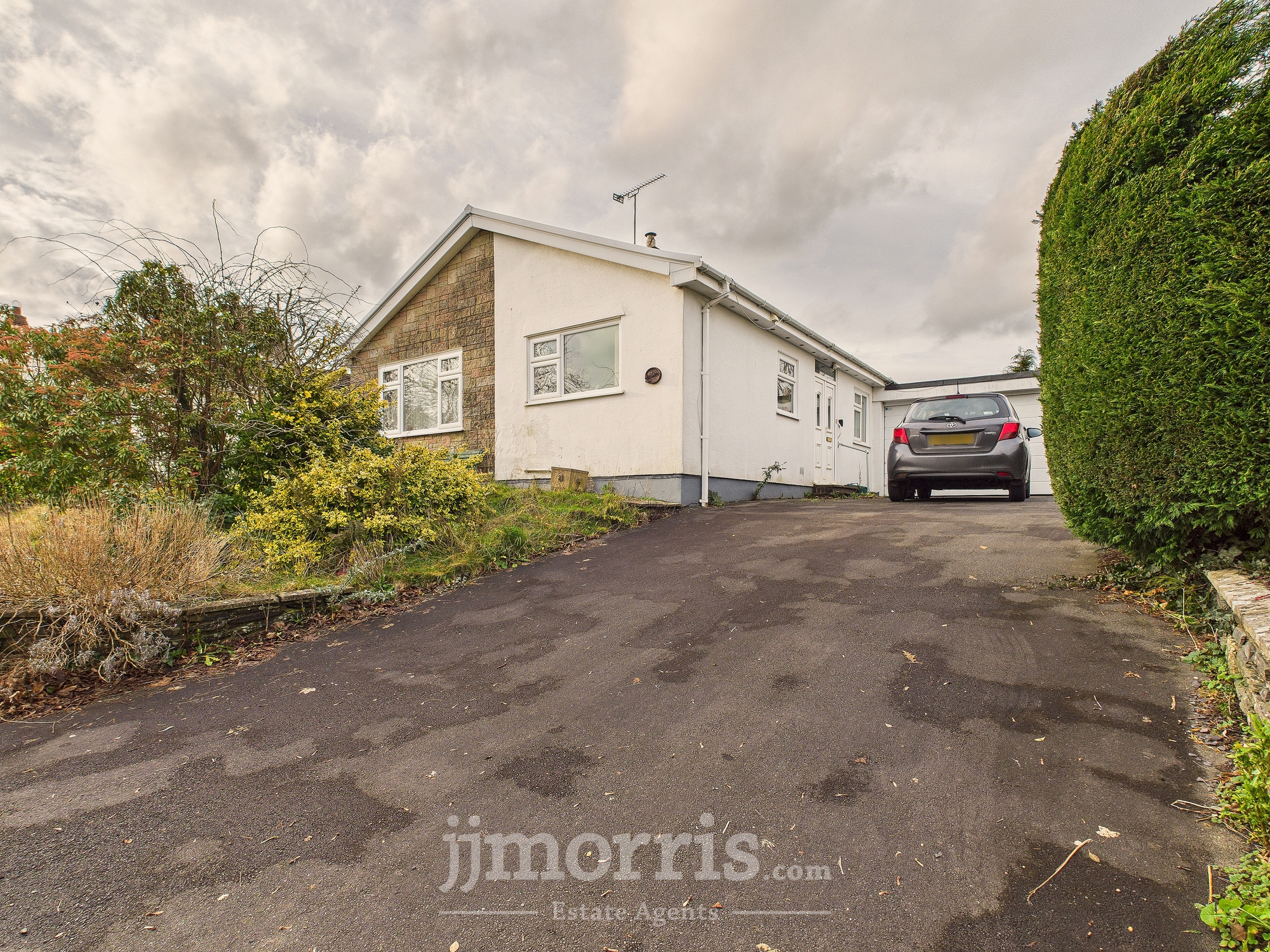 As mentioned above, the property is set back off the road to the fore with a small lawned area, with low-level wall to the road. A driveway leads to the attached single garage which has an up end overdoor with pedestrian door to the rear, opening into the rear garden. The driveway provides off road car parking for 2 or 3 vehicles. To the rear is a small garden with steps rising from a patio onto a lawn that includes several specimen shrubs and trees that that require cutting back. There is also a greenhouse.
